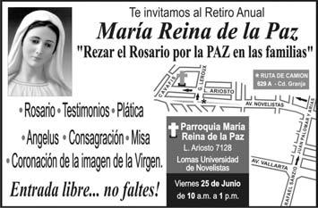 Ven a rezar el Santo Rosario todos los días a las 18 Hrs., en las siguientes Comunidades: Templo Evangelizadora de América (a un costado del Auditorio Benito Juárez) – Norte; San Onofre – Oriente; Parroquia Corpus Christi (Av. Clouthier y Sebastian Bach) – Poniente; Santa Clara de Asís (Av. Patria y Cruz del Sur) – Sur.