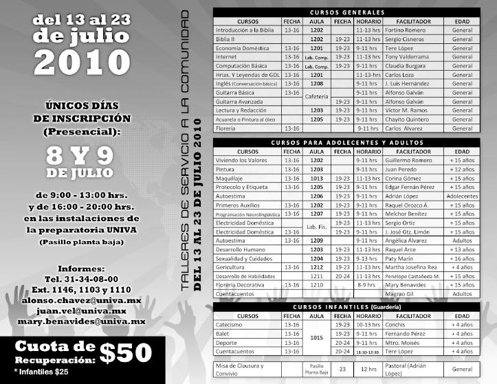 La Sección Diocesana de Evangelización y Catequesis convida a todos los catequistas al Curso de Verano. Las ofertas formativas son: Catequesis General, Catequesis con Adultos y Catequesis Especial, que se realizará del 12 de julio al 7 de agosto. Inscripciones e información, en Román Morales (Calle 32) 517; www.sedecgdl.com; o en 3618-6666.