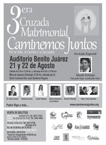 Pláticas Pre-matrimoniales en el Movimiento Familiar Cristiano, la tercera semana de cada mes. Del lunes 16 al viernes 20 de agosto, de las 20 a las 22 horas, en Av. Alemania 1382, Sector Juárez.