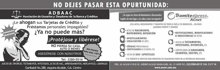 Semanario Arquidiocesano de Guadalajara ❙ Órgano de Formación e Información Católica Semanario Arquidiocesano de Guadalajara, fundado por el Sr. Cardenal Dn. Juan Sandoval Íñiguez, el 24 de enero de 1997 ❙ Registrado ante la Comisión Calificadora de Publicaciones y Revistas Ilustradas —CCPRI— en Certificados de Licitud de Título y Contenido números 10296 y 7226 expediente 1/432“97”/13565 el 20 de enero de 1998 y en el Instituto Nacional de Derecho de Autor, bajo reserva al uso exclusivo del título 04-2001-082208480600-101 el 22 de agosto de 2001 ❙ Registro Postal Publicación Periódica PP14-0002-2000, autorización por SEPOMEX ❙ No se devuelven originales. Los escritos firmados son responsabilidad del autor, no de la publicación ni del titular ❙ Es una publicación editada por Creator Comunicacion, S de RL de CV., con oficinas y redacción en Isla Flores No. 3344-2, Col. Jardines de San José, Guadalajara, Jal., México, C.P. 44950 A.P. 3-31. Teléfono: 3002-6470. Suscripciones ext. 1953 | Publicidad ext. 1925 | Redacción ext. 1922 Horario de oficina: 8:30 am. a 5:30 pm., correo electrónico: semanario@cccomunicaciones.com.mx Página Internet: http://www.semanario.com.mx • Distribución: Mensajería Tercer Milenio, Jarauta No. 510-A, Tels. 3618-9670, planta alta. Guadalajara, Jal. C.P. 44360 Impreso por: Ediciones Católicas de Guadalajara, S.A. de C.V. con oficinas en Isla Flores No. 3344, Col. San José, Tlaquepaque, Jalisco. Tels. 3002-6470. Tiraje: 37,000 a 40,000