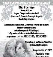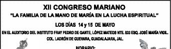 La Comunidad de Consagrados al Inmaculado Corazón de María invita a todo el público a participar en el “XII Congreso Mariano”, en el Auditorio del Instituto Universitario Fray Pedro de Gante (López Mateos Norte 833, esq. con José María Vigil, Col. Ladrón de Guevara), el 14 y 15 de mayo. El lema será: “La Familia, de la mano de María en la Lucha Espiritual”. Algunos de los conferencistas serán el Pbro. Roberto Dueñas Corona, Pbro. Jesús Ceja Álvarez y el Pbro. Alejandro Becerra de la Cruz. Costo de recuperación: Adultos, $100.00, y niños, $ 30.00.