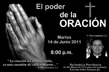 Valora, Conciencia en los Medios, A.C., convoca a la Conferencia “El poder de la oración”, que impartirá el Padre Pedro Castañera, L.C., el martes 14 de junio a las 20 horas, en Hacienda La Providencia (Av. Río Blanco 1727, Lomas del Centinela, Zona San Isidro). La aportación es de 150.00.
