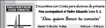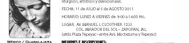 La Pastoral Litúrgica convoca a los Cursos de Verano 2011. El tema sobre Arte, “La dimensión evangelizadora y misionera del patrimonio cultural de la Iglesia Católica, expresada en los Cristos de pasta de caña”, que expondrá Mons. Rafael Uribe Pérez, en La Santa Cruz, del 4 al 8 de julio. Sobre Liturgia, “La Celebración Eucarística y misión de la Iglesia”, lo expondrá el Pbro. Guillermo L. Rodríguez Benítez, del 11 al 15 de julio, en Nuestra Señora del Rosario (Pino Suárez 47, Toluquilla). Informes, al Tel. 3601-0530. Los dos Talleres, de las 19.45 a las 21.15 horas.