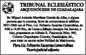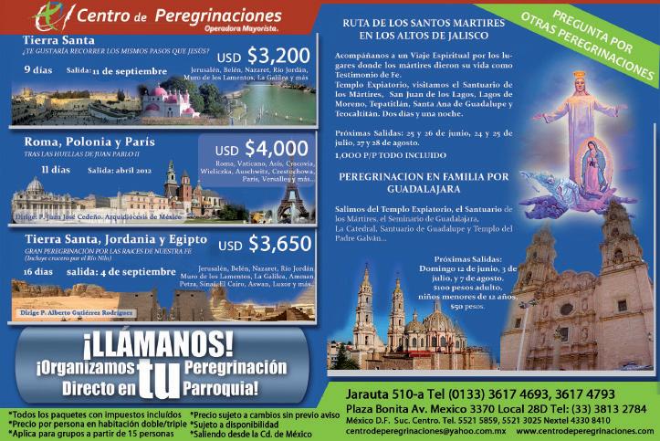 Semanario Arquidiocesano de Guadalajara Órgano de Formación e Información Católica Semanario Arquidiocesano de Guadalajara, fundado por el Sr. Cardenal Dn. Juan Sandoval Íñiguez, el 24 de enero de 1997 Registrado ante la Comisión Calificadora de Publicaciones y Revistas Ilustradas —CCPRI— en Certificados de Licitud de Título y Contenido números 10296 y 7226 expediente 1/432“97”/13565 el 20 de enero de 1998 y en el Instituto Nacional de Derecho de Autor, bajo reserva al uso exclusivo del título 04-2001-082208480600-101 el 22 de agosto de 2001 Registro Postal Publicación Periódica PP14-0002-2000, autorización por SEPOMEX No se devuelven originales. Los escritos firmados son responsabilidad del autor, no de la publicación ni del titular Es una publicación editada por Creator Comunicacion, S de RL de CV., con oficinas y redacción en Isla Flores No. 3344-2, Col. Jardines de San José, Guadalajara, Jal., México, C.P. 44950 A.P. 3-31. Teléfono: 3002-6470. Suscripciones ext. 1953 | Publicidad ext. 1925 | Redacción ext. 1922 Horario de oficina: 8:30 am. a 5:30 pm., correo electrónico: semanario@cccomunicaciones.com.mx