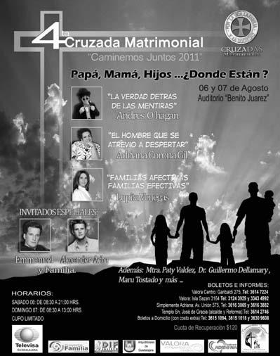 El Movimiento Familiar Cristiano convoca a asistir a sus Pláticas Prematrimoniales, que se llevarán a cabo, de lunes a viernes, en el mes de julio, de las 20 a las 22 horas, en Av. Alemania 1382, Col. Moderna. Para mayores informes, comunícate al Tel: 3812-1708.