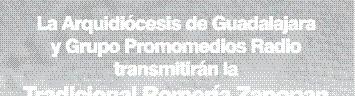 Bajo el lema “Virgen de Zapopan, nuestra Pacificadora, concede la paz a nuestra Patria”, se efectuarán todos los actos religiosos: Misa del Patrocinio en la Explanada del Instituto Cabañas; Velada y Misa de Despedida en la Catedral; Romería y Misa de Bienvenida en el atrio de la Basílica, que implican las Fiestas Patronales de la Arquidiócesis, con motivo del triunfal regreso de La Generala a su Santuario