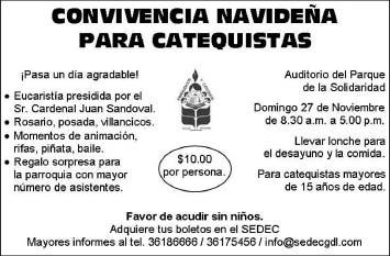El Movimiento Laical Interdiocesano de Espiritualidad y Vida Interior hace una invitación al Retiro “Discípulos Misioneros de Cristo Rey”, el domingo 27 de noviembre de las 9 a las 18 horas, en la sede del Movimiento (Privada López Mateos 9, Col. El Zapote, Tonalá). Se contará con la presencia del Obispo Auxiliar J. Trinidad González Rodríguez. Más información, al 3823-0464.
