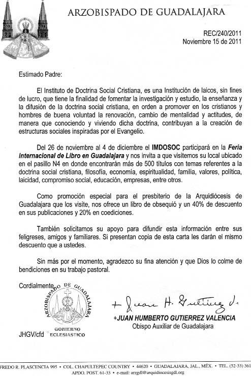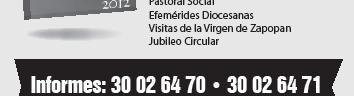 Semanario Arquidiocesano de Guadalajara Órgano de Formación e Información Católica Semanario Arquidiocesano de Guadalajara, fundado por el Sr. Cardenal Dn. Juan Sandoval Íñiguez, el 24 de enero de 1997 Registrado ante la Comisión Calificadora de Publicaciones y Revistas Ilustradas —CCPRI— en Certificados de Licitud de Título y Contenido números 10296 y 7226 expediente 1/432“97”/13565 el 20 de enero de 1998 y en el Instituto Nacional de Derecho de Autor, bajo reserva al uso exclusivo del título 04-2011-070709061600-101 el 7 de julio de 2011 Registro Postal Publicación Periódica PP14-0002-2000, autorización por SEPOMEX No se devuelven originales. Los escritos firmados son responsabilidad del autor, no de la publicación ni del titular Es una publicación editada por Creator Comunicacion, S de RL de CV., con oficinas y redacción en Isla Flores No. 3344-2, Col. Jardines de San José, Guadalajara, Jal., México, C.P. 44950 A.P. 3-31. Teléfono: 3002-6470. Suscripciones ext. 1953 | Publicidad ext. 1925 | Redacción ext. 1922 Horario de oficina: 8:30 am. a 5:30 pm., correo electrónico: semanario@cccomunicaciones.com.mx Página Internet: http://www.semanario.com.mx • Distribución: Mensajería Tercer Milenio, Jarauta No. 510-A, Tels. 3618-9670, planta alta. Guadalajara, Jal. C.P. 44360
