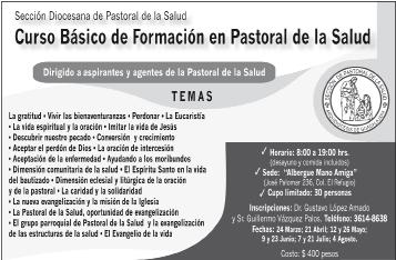 Invita a todos los Agentes de Pastoral a participar en el Coloquio Cristológico: “Los diálogos de Jesús en San Juan”, el 11 de marzo en las instalaciones del Instituto Bíblico (Av. la Paz 1665), de las 10 a las 13.30 horas. Cooperación, $30.00. Llevar cuaderno y Biblia. Informes, al 3121-0395.