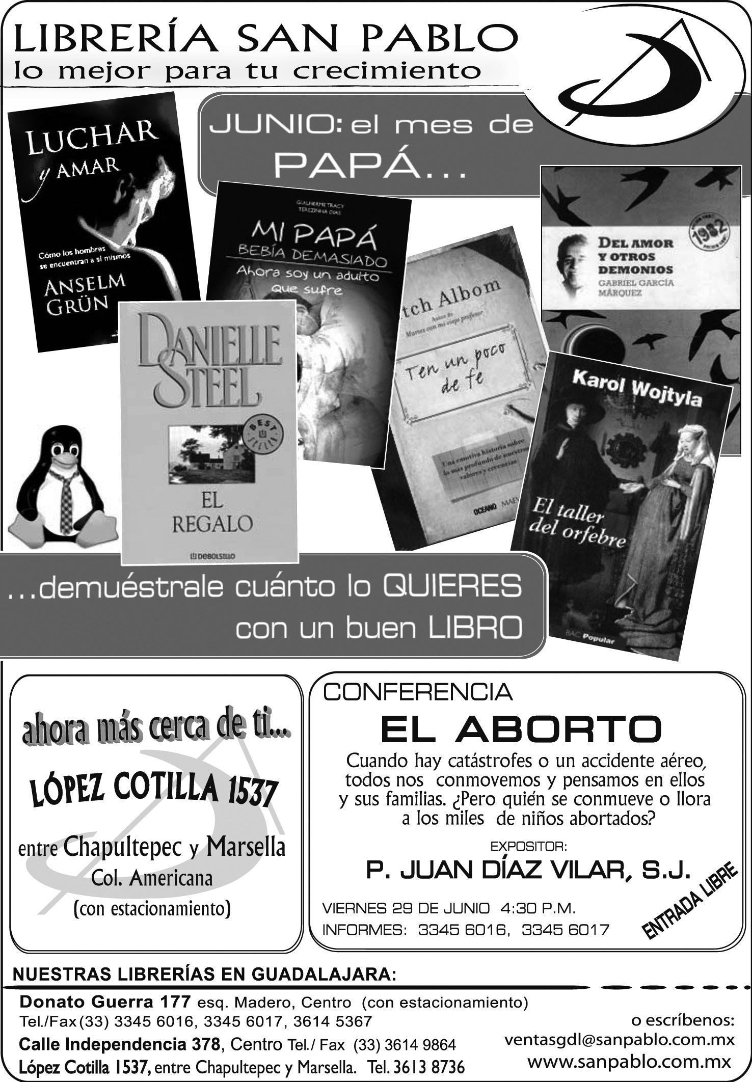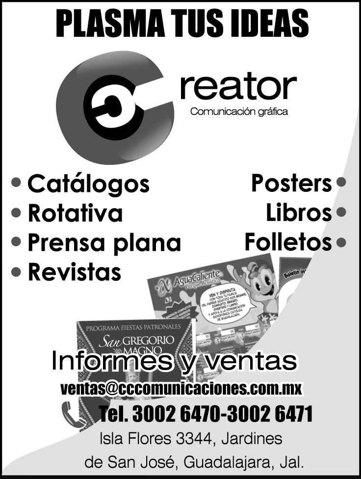 Órgano de Formación e Información Católica Semanario Arquidiocesano de Guadalajara, fundado por el Sr. Cardenal Dn. Juan Sandoval Íñiguez, el 24 de enero de 1997 Registrado ante la Comisión Calificadora de Publicaciones y Revistas Ilustradas —CCPRI— en Certificados de Licitud de Título y Contenido números 10296 y 7226 expediente 1/432“97”/13565 el 20 de enero de 1998 y en el Instituto Nacional de Derecho de Autor, bajo reserva al uso exclusivo del título 04-2011-070709061600-101 el 7 de julio de 2011 Registro Postal Publicación Periódica PP14-0002-2000, autorización por SEPOMEX No se devuelven originales. Los escritos firmados son responsabilidad del autor, no de la publicación ni del titular Es una publicación editada por Creator Comunicación, S. de RL. de CV., con oficinas y redacción en Isla Flores No. 3344-2, Col. Jardines de San José, Guadalajara, Jal., México, C.P. 44950 A.P. 3-31.