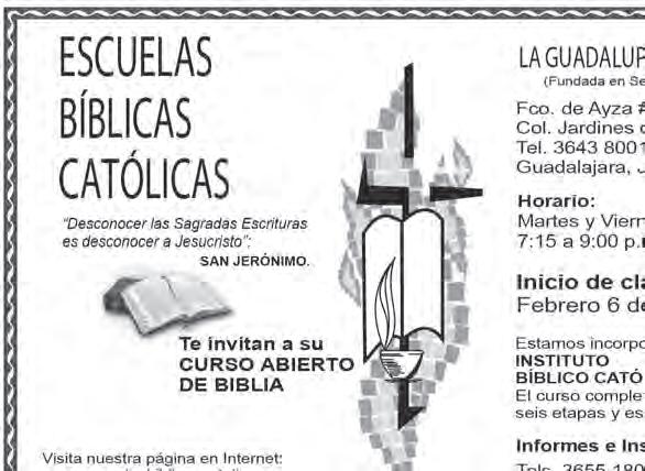 ANIMACIÓN BÍBLICA DE LA PASTORAL Invita a vivir la experiencia de disfrutar y conocer la Palabra de Dios en el Taller de “Formación de Círculos Bíblicos”, que se llevará a cabo el domingo 8 de febrero en las instalaciones del Instituto Bíblico Católico (Av. de la Paz 1665, Col Americana), de las 9.30 a las 14 horas. Cooperación, $30.00. Informes, al Cel. 33-1289-9633 ó al correo electrónico: animacionbvpgdl@gmail.com.