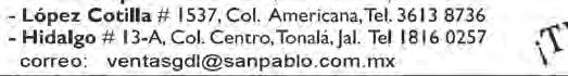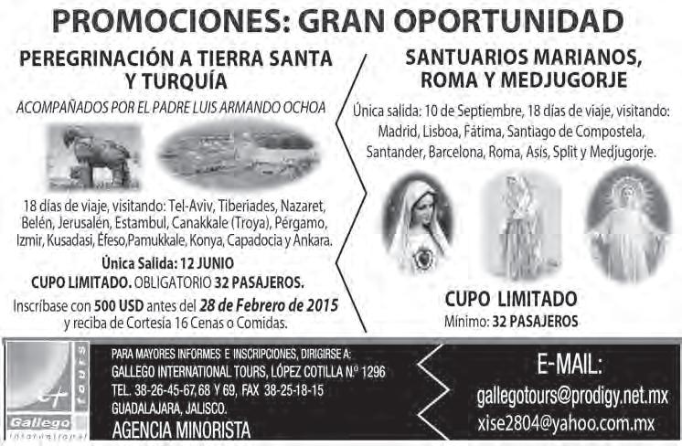 Teléfono: 3002-6470. Suscripciones: Ext. 1970 | Publicidad: Ext. 1925 | Redacción: Ext. 1922 Horario de oficina: 8:30 a.m. a 5:30 p.m., correo electrónico: semanario@cccomunicaciones.com.mx Página Internet: http://www.semanario.com.mx • Distribución: Mensajería Tercer Milenio, Jarauta N. 510-A, Tel. 3618-9670, planta alta. Guadalajara, Jal. C.P. 44360 Impreso por: Ediciones Católicas de Guadalajara, S.A. de C.V. con oficinas en Isla Flores N. 3344, Col. San José, Tlaquepaque, Jalisco. Tel. 3002-6470. Tiraje: 37,000 a 40,000