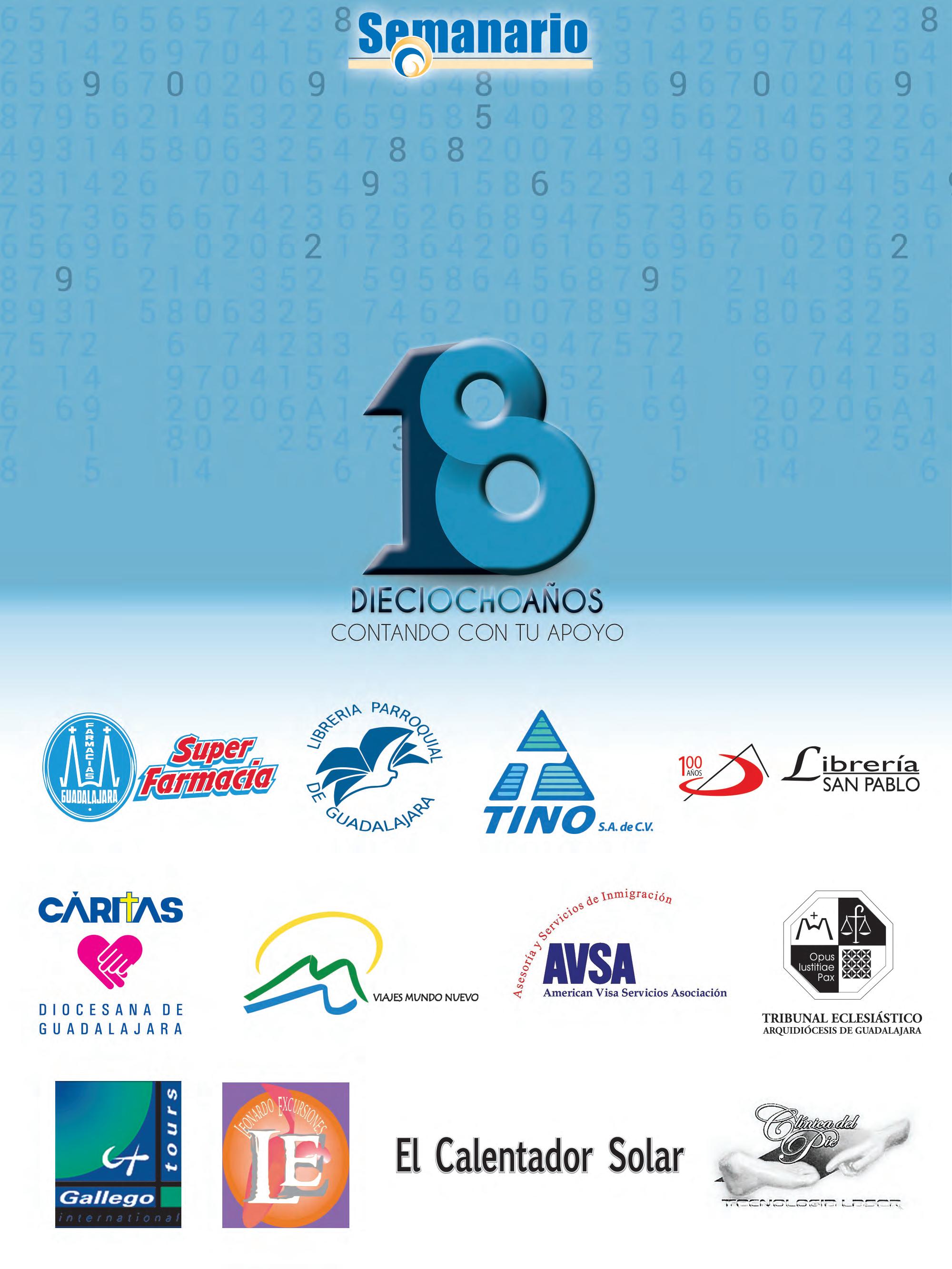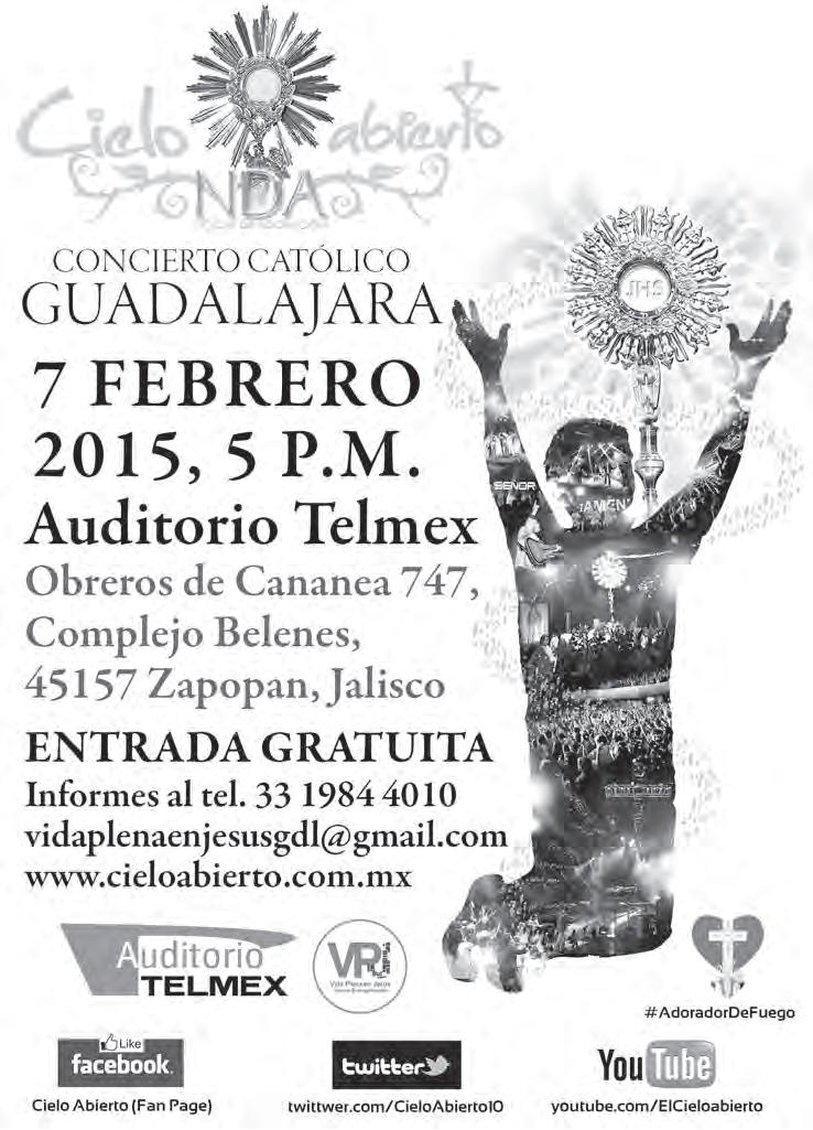 Semanario Arquidiocesano de Guadalajara • Órgano de Formación e Información Católica • Semanario Arquidiocesano de Guadalajara, fundado por el Sr. Cardenal Dn. Juan Sandoval Íñiguez, el 24 de enero de 1997 • Registrado ante la Comisión Calificadora de Publicaciones y Revistas Ilustradas —CCPRI— en Certificados de Licitud de Título y Contenido números 10296 y 7226 expediente 1/432“97”/13565 el 20 de enero de 1998 y en el Instituto Nacional de Derecho de Autor, bajo reserva al uso exclusivo del título 04-2011-070709061600-101 el 7 de julio de 2011 • Registro Postal Publicación Periódica PP14-0002-2000, autorización por SEPOMEX • No se devuelven originales. Los escritos firmados son responsabilidad del autor, no de la publicación ni del titular • Es una publicación editada por Creator Comunicación, S. de R.L. de C.V., con oficinas y redacción en Isla Flores N. 3344-2, Col. Jardines de San José, Guadalajara, Jal., México, C.P. 44950 A.P. 3-31.