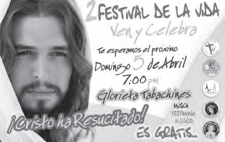 La Sección Diocesana de Evangelización y Catequesis, en el marco de la celebración de sus 100 Años, y por su misión de fomentar los valores, convida a Parroquias, Clubs deportivos y Escuelas a participar en el Torneo Relámpago de Futbol, para niños de 10 a 12 años, y a Catequistas a participar en un torneo de Volibol el domingo 3 de mayo en el Seminario Menor de Guadalajara, de las 8 a las 17 horas. Ven, participa y gana interesantes premios. Informes, al 3618-6666 ó en la página del SEDEC www.sedecgdl.com Se convoca a participar en un evento en el que Patricia Sandoval compartirá un conmovedor e impactante testimonio sobre la vida de una chica y sus tres abortos, an- tes de ser tocada por Dios, “Érase una vez una vida”, del 7 al 11 de mayo. Informes, 3125-1676.