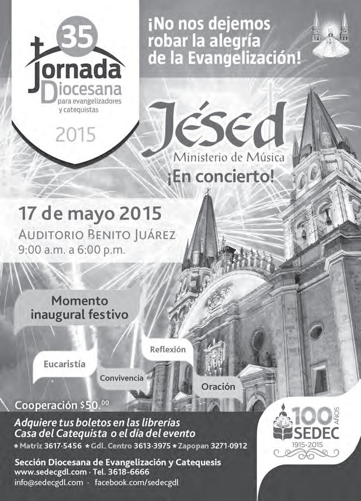 SEDEC ¡No nos dejemos robar la alegría del Evangelio! En su Primer Centenario, esta Sección invita a su Jornada Diocesana para Evangelizadores y Catequistas. Estará el Ministerio Jésed en Concierto, el domingo 17 de mayo, de las 9 a las 18 horas en el Auditorio Benito Juárez. Costo, 50 pesos. Informes en: Calle 32 ó Román Morales # 517, S.L., entre Industria y Federación, o al Tel. 3618-6666. ¡Te esperamos, no faltes!