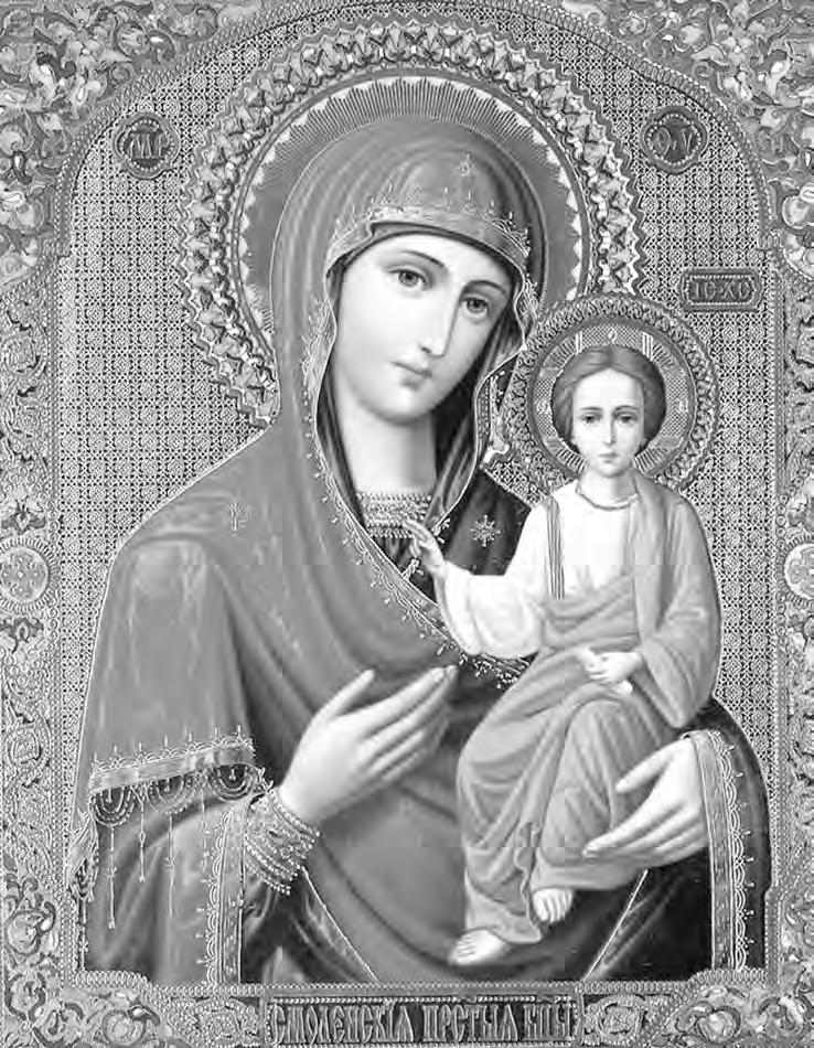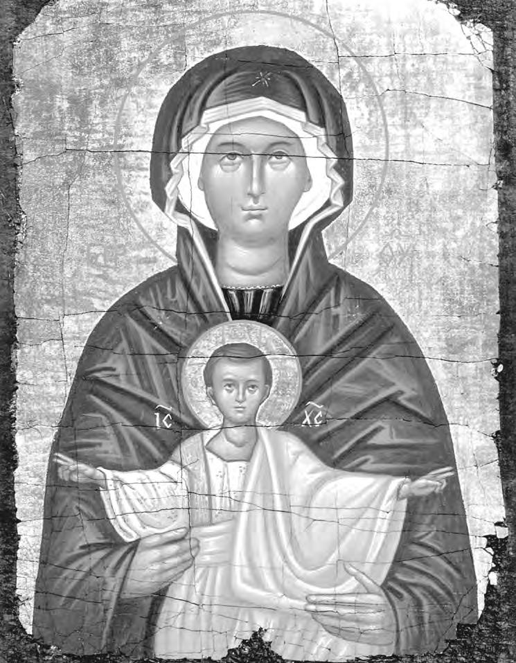 La Theotokos –del griego ‘Madre de Dios’ o ‘La que da a luz a Dios’–se presenta sedente con el Niño Jesús en su regazo, mirando ambos hacia el frente. El omophorion luce