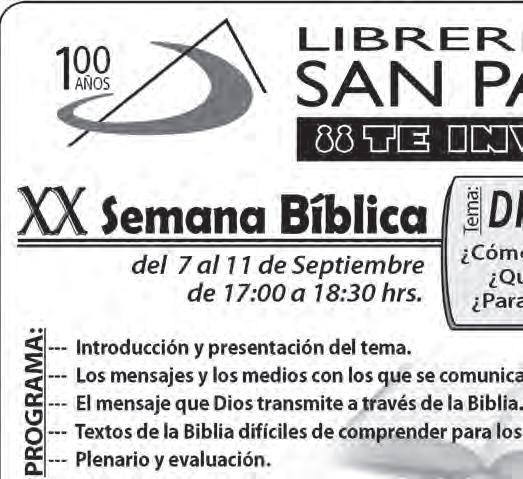 Las Parroquias del Decanato de Getsemaní convocan a la Semana Bíblica, en el mes de septiembre, con el Tema “La Familia Santuario de Vida y Fe”, en El Divino Salvador, del 31 de agosto al 4 de septiembre, a las 20 horas; en Belén de Jesús, del 1º al 4 septiembre, a las 20.45 Hrs.; en Santa Edwiges del 7 al 11, a las 19 Hrs.; en Getsemaní de la Cruz, del 21 al 25, a las 20 Hrs. La Parroquia de Nuestra Señora de la Paz tendrá la Semana Bíblica, impartida por el Pbro. Fidel Martínez Ramírez, del 31 de agosto al 4 de septiembre, a las 19 horas, en las instalaciones de Av. La Paz 2086. Informes, al 3615-0211.