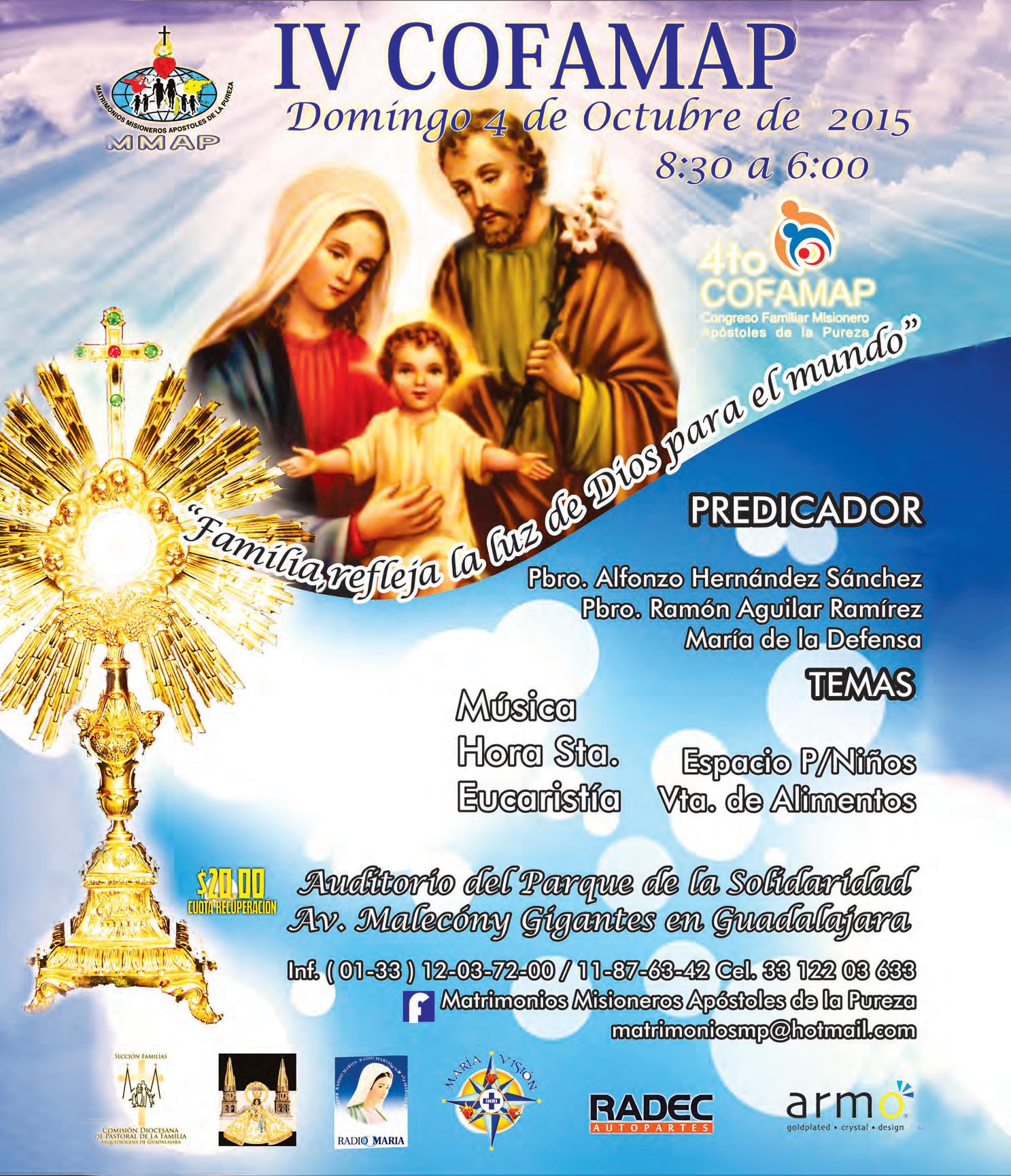 El Ministerio “Tiempo de Evangelizar” invita al Congreso Católico “Despierta, Nación Consagrada en la Verdad”, los días 3 y 4 de octubre. Habrá Predicaciones, Hora Santa, Alabanza, Obra de Teatro y testimonios (entre ellos, un ex travesti), en el Auditorio Charles Chaplin, de las 8.30 a las 18.30 horas. Boletos en la Librería del Arzobispado. Cel. 33-1075-4608.