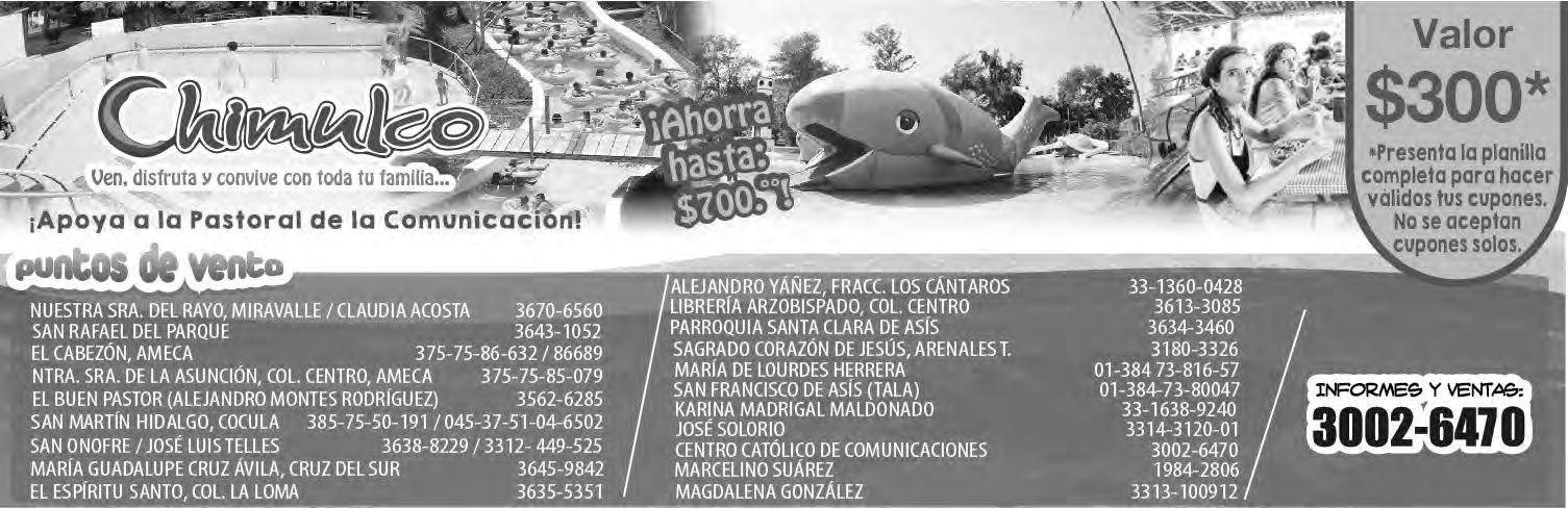 Horario de oficina: 8:30 a.m. a 5:30 p.m., correo electrónico: semanario@cccomunicaciones.com.mx Página Internet: http://www.semanario.com.mx • Distribución: Mensajería Tercer Milenio, Jarauta N. 510-A, Tel. 3618-9670, planta alta. Guadalajara, Jal. C.P. 44360 Impreso por: Ediciones Católicas de Guadalajara, S.A. de C.V. con oficinas en Isla Flores N. 3344, Col. San José, Tlaquepaque, Jalisco. Tel. 3002-6470. Tiraje: 37,000 a 40,000