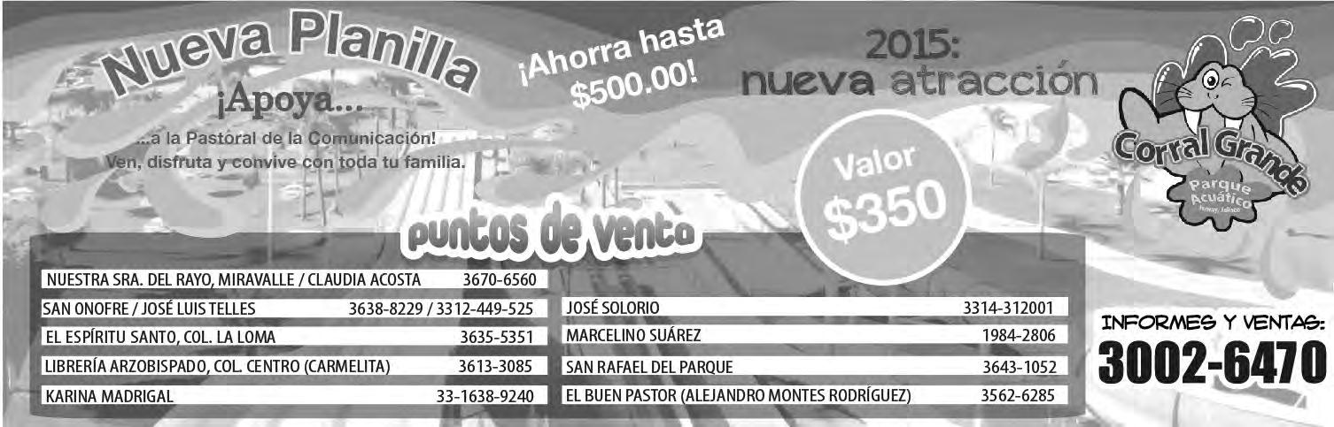 Semanario Arquidiocesano de Guadalajara • Órgano de Formación e Información Católica • Semanario Arquidiocesano de Guadalajara, fundado por el Sr. Cardenal Dn. Juan Sandoval Íñiguez, el 24 de enero de 1997 • Registrado ante la Comisión Calificadora de Publicaciones y Revistas Ilustradas —CCPRI— en Certificados de Licitud de Título y Contenido números 10296 y 7226 expediente 1/432“97”/13565 el 20 de enero de 1998 y en el Instituto Nacional de Derecho de Autor, bajo reserva al uso exclusivo del título 04-2011-070709061600-101 el 7 de julio de 2011 • Registro Postal Publicación Periódica PP14-0002-2000, autorización por SEPOMEX • No se devuelven originales. Los escritos firmados son responsabilidad del autor, no de la publicación ni del titular • Es una publicación editada por Creator Comunicación, S. de R.L. de C.V., con oficinas y redacción en Isla Flores N. 3344-2, Col. Jardines de San José, Guadalajara, Jal., México, C.P. 44950 A.P. 3-31.