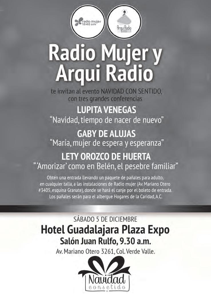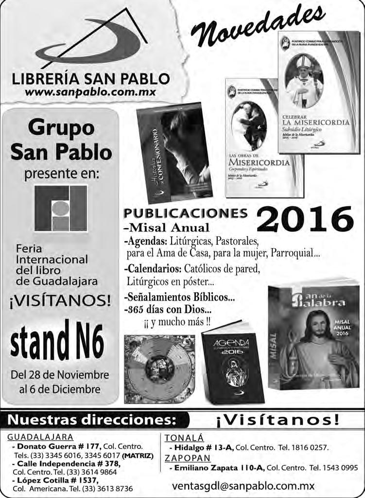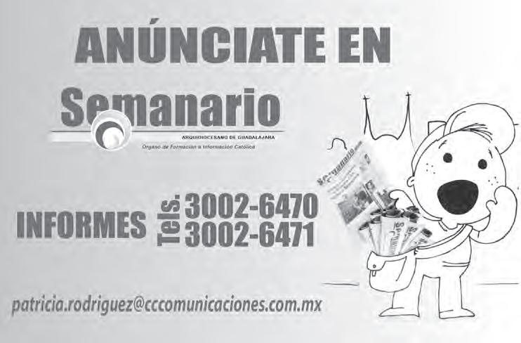 Semanario Arquidiocesano de Guadalajara • Órgano de Formación e Información Católica • Semanario Arquidiocesano de Guadalajara, fundado por el Sr. Cardenal Dn. Juan Sandoval Íñiguez, el 24 de enero de 1997 • Registrado ante la Comisión Calificadora de Publicaciones y Revistas Ilustradas —CCPRI— en Certificados de Licitud de Título y Contenido números 10296 y 7226 expediente 1/432“97”/13565 el 20 de enero de 1998 y en el Instituto Nacional de Derecho de Autor, bajo reserva al uso exclusivo del título 04-2011-070709061600-101 el 7 de julio de 2011 • Registro Postal Publicación Periódica PP14-0002-2000, autorización por SEPOMEX • No se devuelven originales. Los escritos firmados son responsabilidad del autor, no de la publicación ni del titular • Es una publicación editada por Creator Comunicación, S. de R.L. de C.V., con oficinas y redacción en Isla Flores N. 3344-2, Col. Jardines de San José, Guadalajara, Jal., México, C.P. 44950 A.P. 3-31.