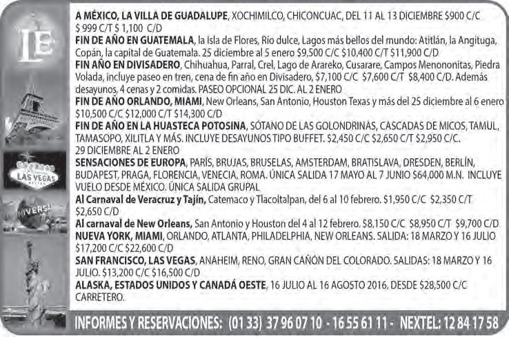 Teléfono: 3002-6470. Suscripciones: Ext. 1954 | Publicidad: Ext. 1925 | Redacción: Ext. 1922 Horario de oficina: 8:30 a.m. a 5:30 p.m., correo electrónico: semanario@cccomunicaciones.com.mx Página Internet: http://www.semanario.com.mx • Distribución: Mensajería Tercer Milenio, Jarauta N. 510-A, Tel. 3618-9670, planta alta. Guadalajara, Jal. C.P. 44360
