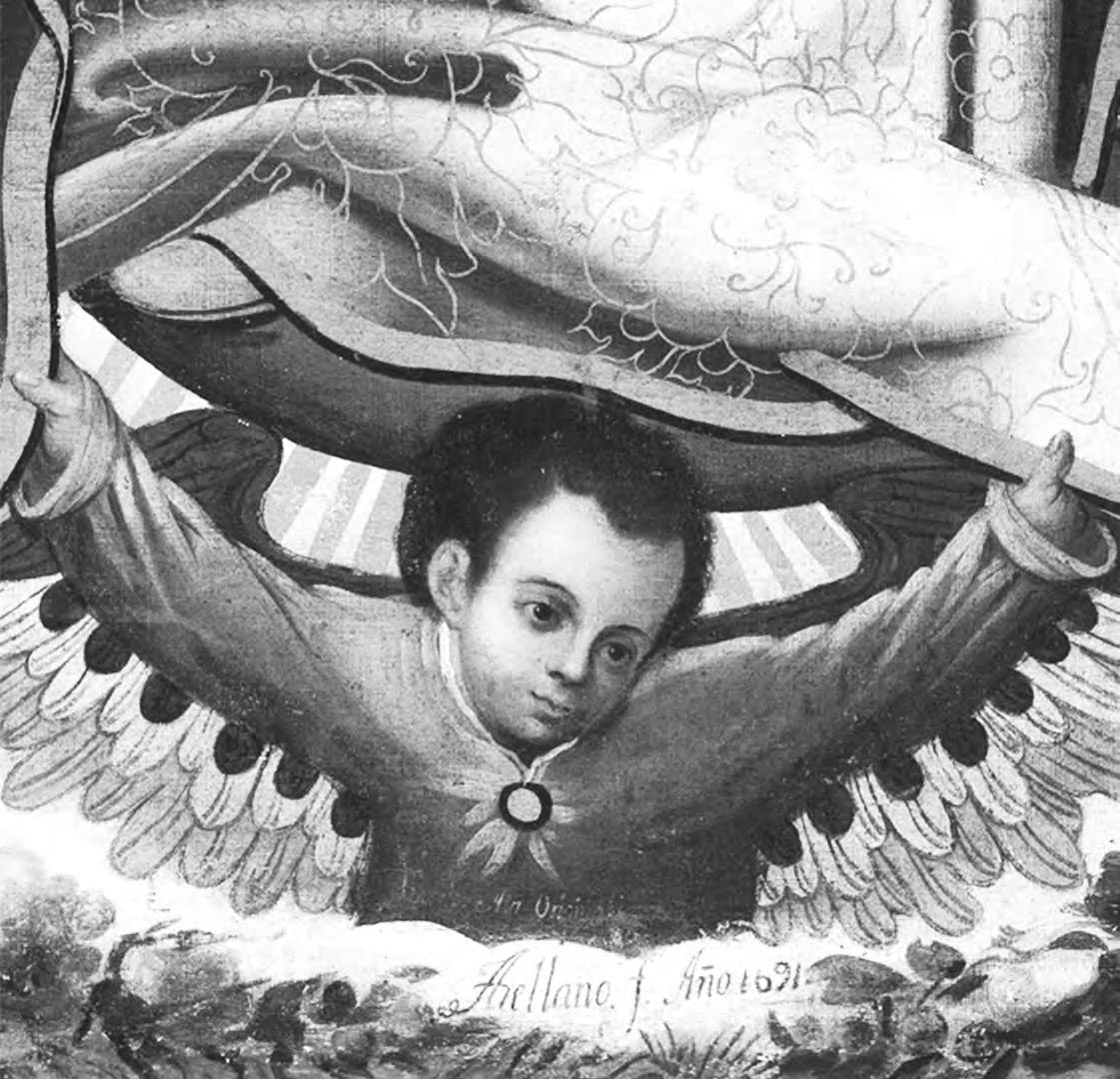 “Llena de Gracia”, con alas tricolores extendidas. En efecto, las alas de San Gabriel son de color verde, blanco y rojo. Colores que, para un observador mexicano, son referencia inmediata del color de las alas del Ángel que se encuentra debajo de la imagen de la Virgen de México, Santa María de Guadalupe.