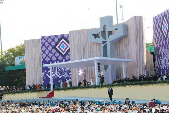 El momento llegó, y el Papa Francisco ingresó al Estadio, que explotó en gritos y ovaciones al reconocer en él al máximo Pastor del rebaño católico. Todos queríamos estar cerca de él, y al grito de “vuelta, vuelta”, él rodeó todo el Estadio para saludar y expresar su cariño a todos los convocados. Al comienzo de la Eucaristía notamos un Papa cansado y agitado por el peso del Viaje Apostólico, pero eso no mermó la energía de su homilía, que atinadamente nos exhortó, entre otros puntos, a lo siguiente: Jesús, en el misterio de su vida,