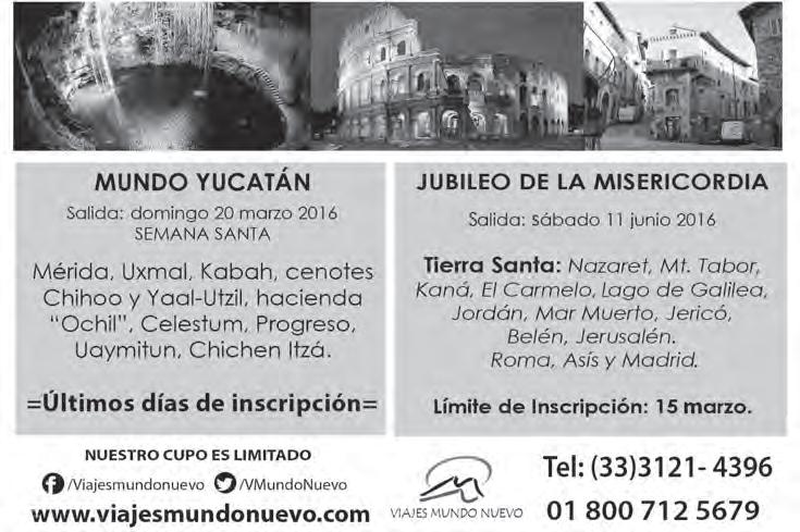Horario de oficina: 8:30 a.m. a 5:30 p.m., correo electrónico: semanario@cccomunicaciones.com.mx Página Internet: http://www.semanario.com.mx • Distribución: Mensajería Tercer Milenio, Jarauta N. 510-A, Tel. 3618-9670, planta alta. Guadalajara, Jal. C.P. 44360 Impreso por: Ediciones Católicas de Guadalajara, S.A. de C.V. con oficinas en Isla Flores N. 3344, Col. San José, Tlaquepaque, Jalisco. Tel. 3002-6470. Tiraje: 37,000 a 40,000