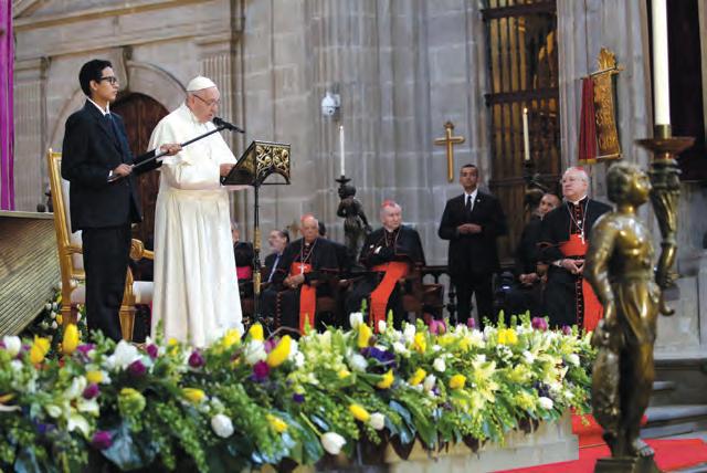 Reunidos en el patio central del Palacio Nacional, en la Ciudad de México, el Sumo Pontífice aseveró que un pueblo con juventud es capaz de renovarse y de alzar la mirada hacia el futuro. Por ello, es necesario reflexionar sobre la responsabilidad de construir el México que se dejará a las siguientes generaciones.