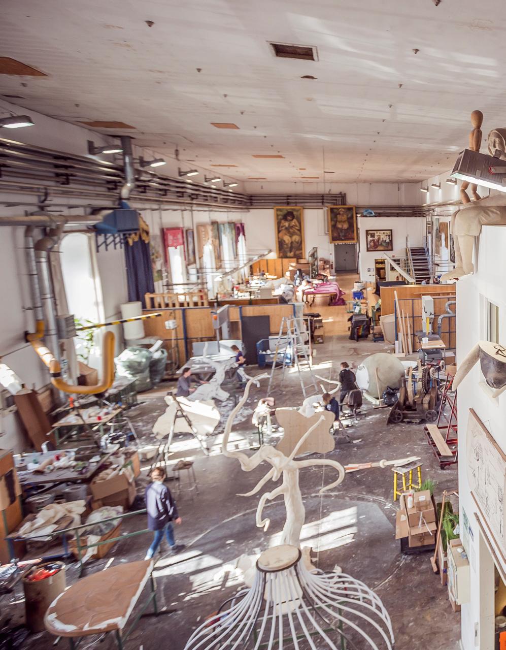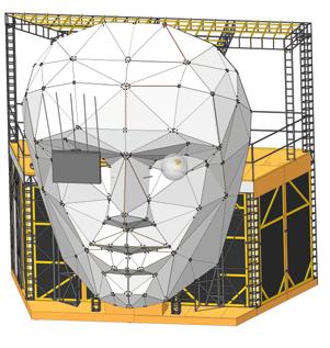 Entworfen von der Bühnenbildnerin Aída Leonor Guardia, kam er in die technischen Abteilungen (künstlerische Mitarbeit Bühnenbild: Arne Walther). Es wurde geprüft, was die Materialien (v. a. Stahl und Holz) kosten und wie viele Stunden in den Werkstätten benötigt werden. Die Sicherheit für alle, die auf und im Kopf spielen, muss gewährleistet sein. Die Konstruktionsabteilung erfand technische Lösungen für szenische Wünsche, erstellte ein 3D-CAD-Modell, organisierte die Transportteilungen sowie Montagekonzepte und -anleitungen. Die Dekorationswerkstätten (v. a. Schlosserei, Tischlerei, Malsaal und Plastik) übernahmen die Ausführung.