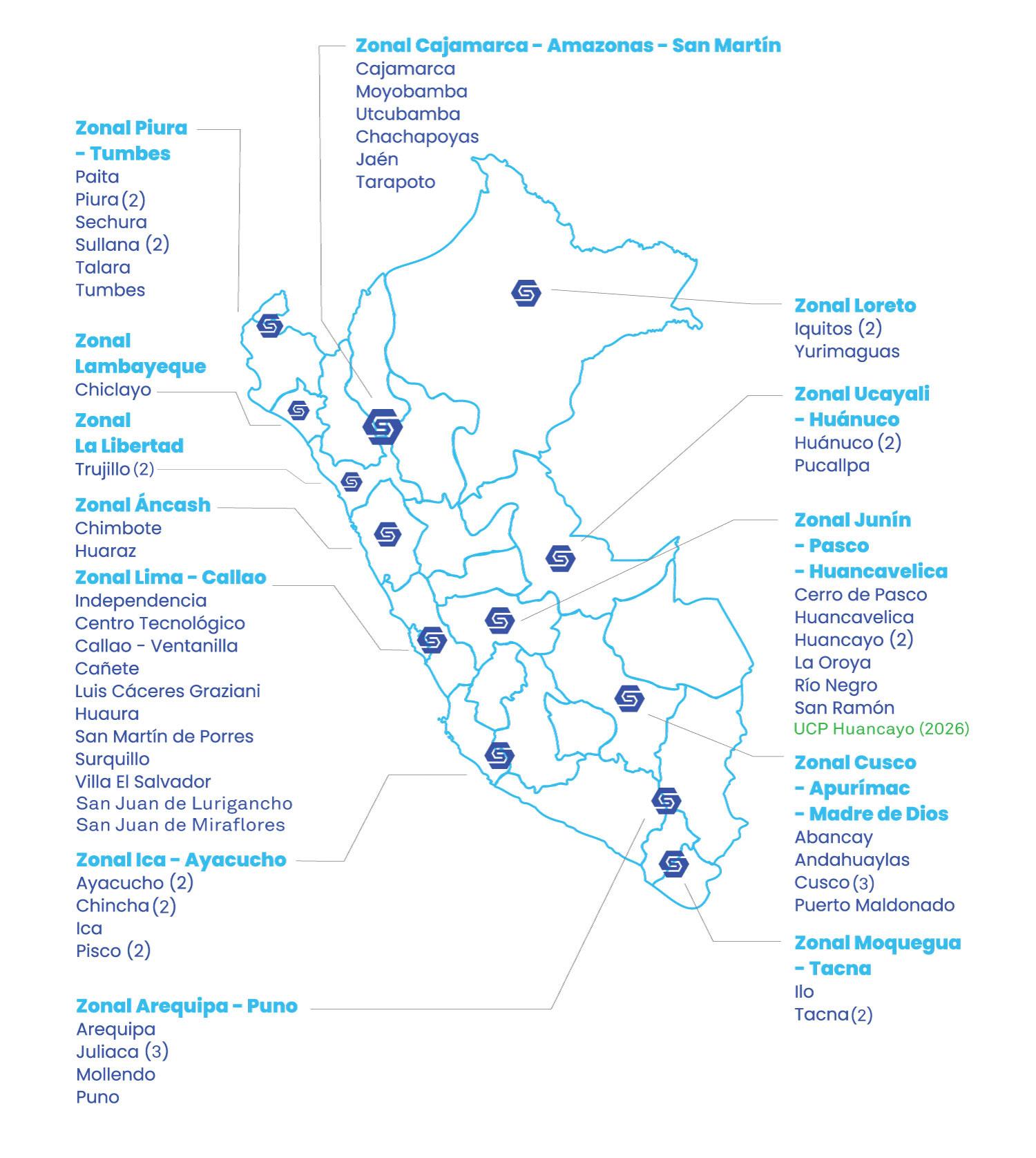 os enorgullece estar presente en todo el país con sedes que reflejan nuestro crecimiento institucional. Al cierre del 2025, contamos con 66 Centros de Formación Profesional, organizados en 13 Direcciones Zonales, que nos permiten llevar formación profesional tecnológica de calidad a todo el país.