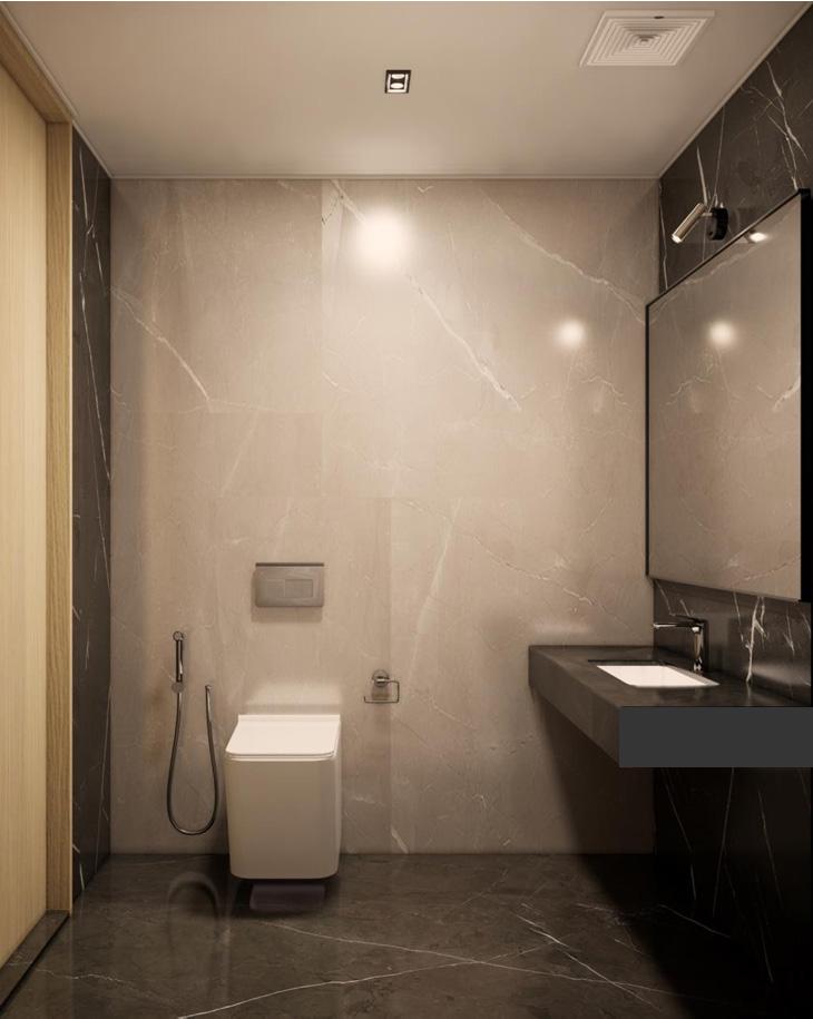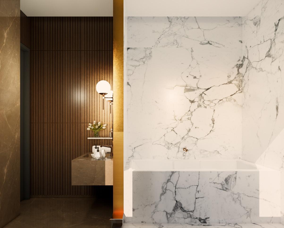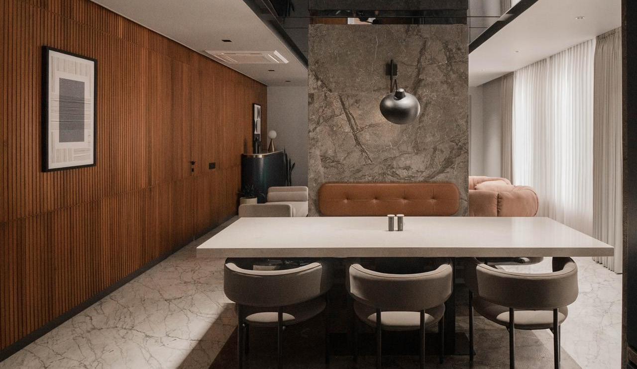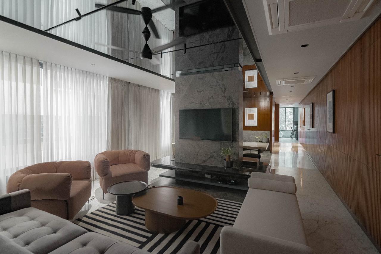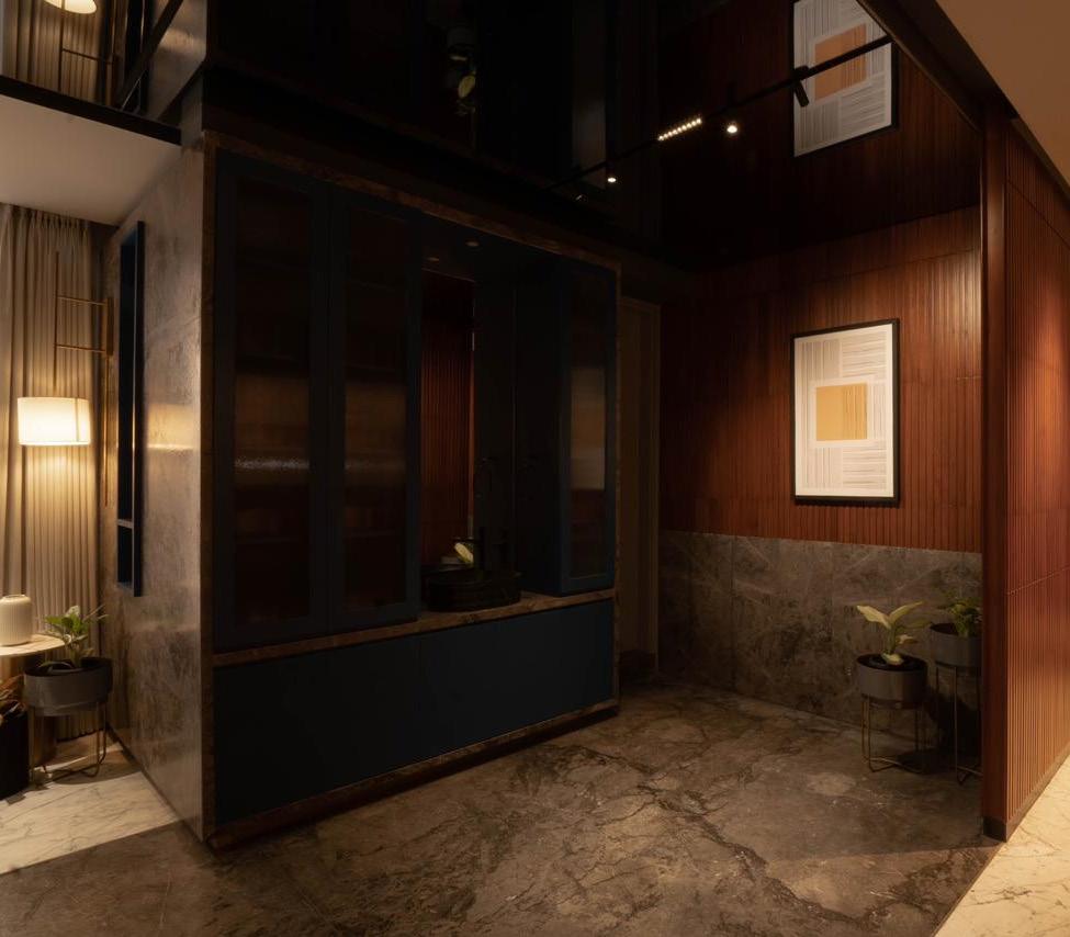 The apartment interior epitomizes contemporary sophistication with a neutral color palette accentuated by luxurious wood textures, achieving a seamless equilibrium between modernity and warmth. Minimalist furniture pieces enhance the sense of spaciousness while fulfilling functional needs. A distinct feature of the space is the clever use of varying levels of transparency to establish privacy without compromising on openness. This innovative approach to design is complemented by a thoughtful integration of different design elements adding layers of visual interest and depth to the overall ambiance.
