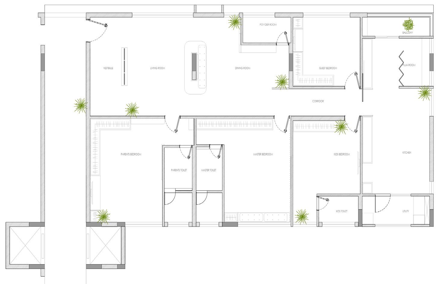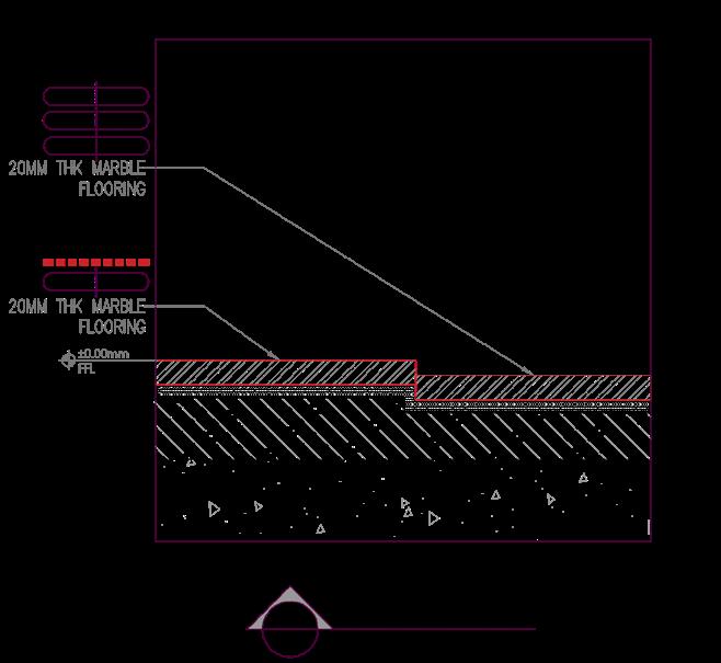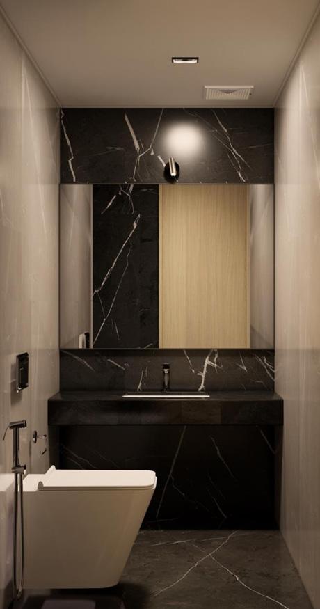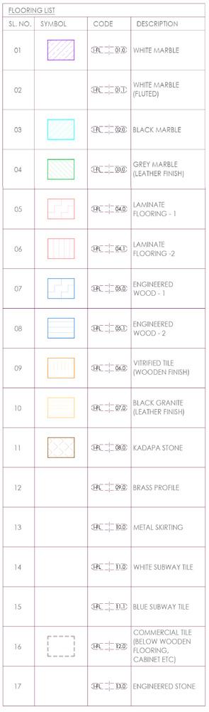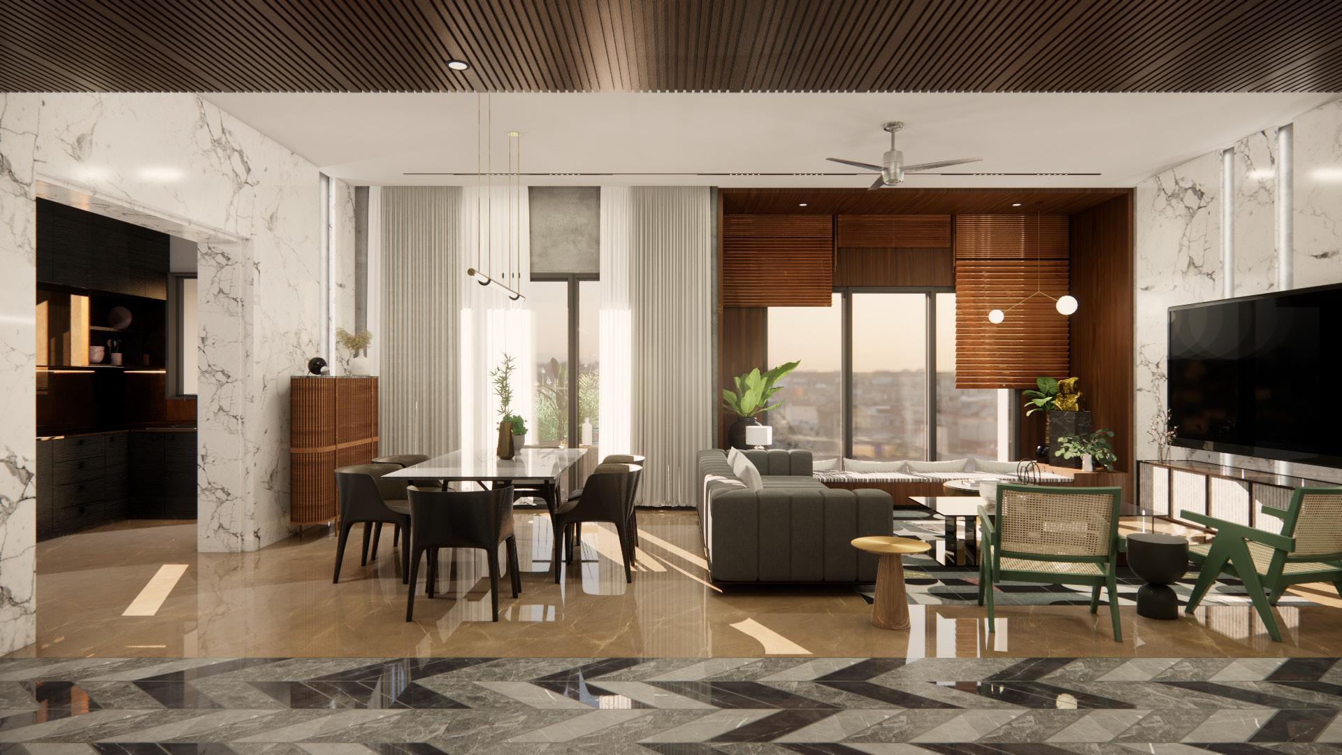 A flooring pattern with white, grey and black marble inserts leads one from the entrance corridor to the living, dining and the bedrooms.