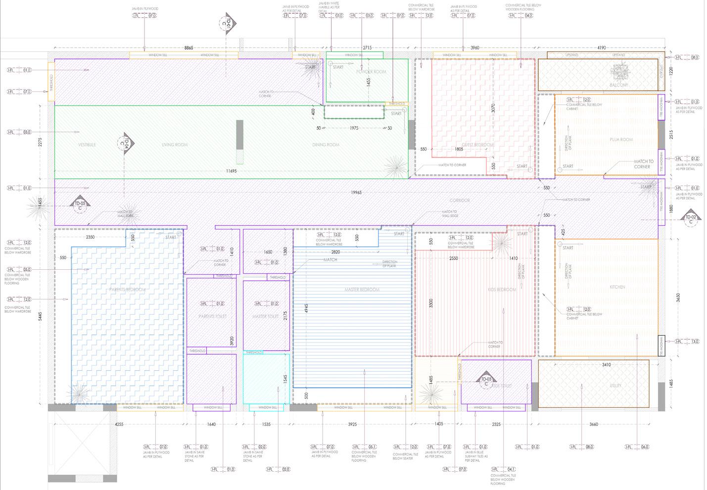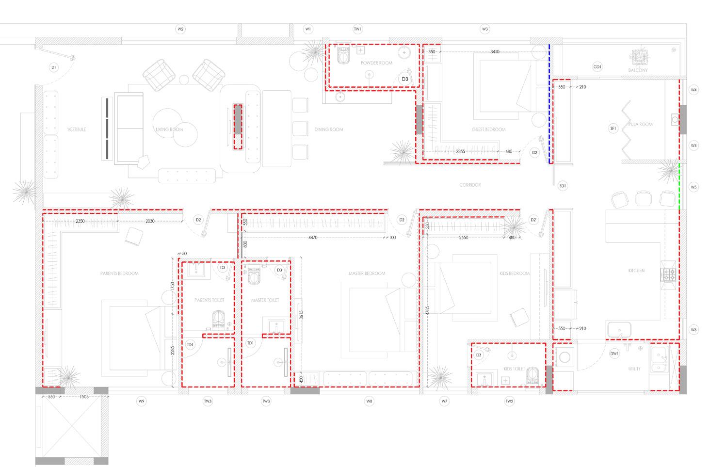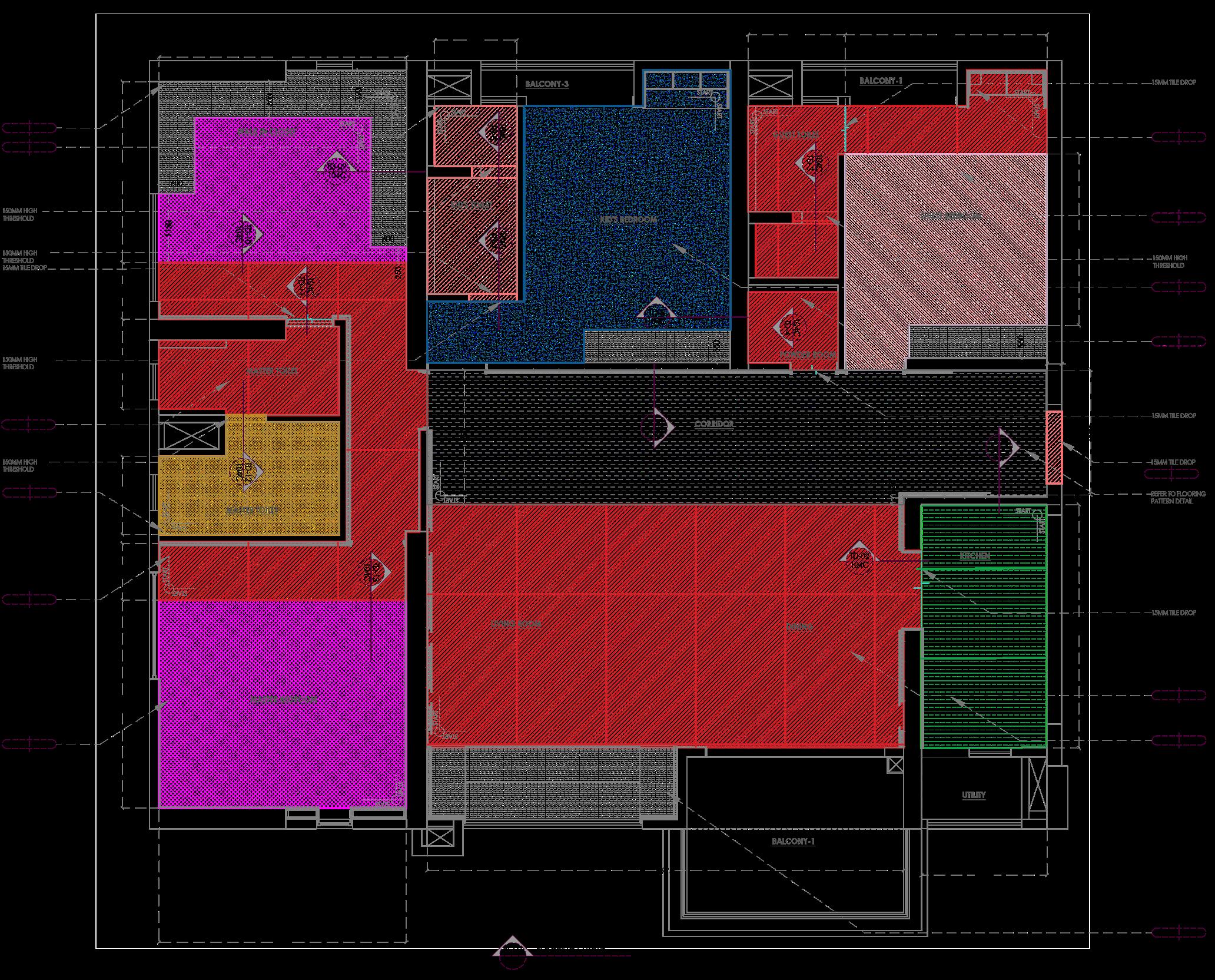 A flooring pattern with white, grey and black marble inserts leads one from the entrance corridor to the living, dining and the bedrooms.