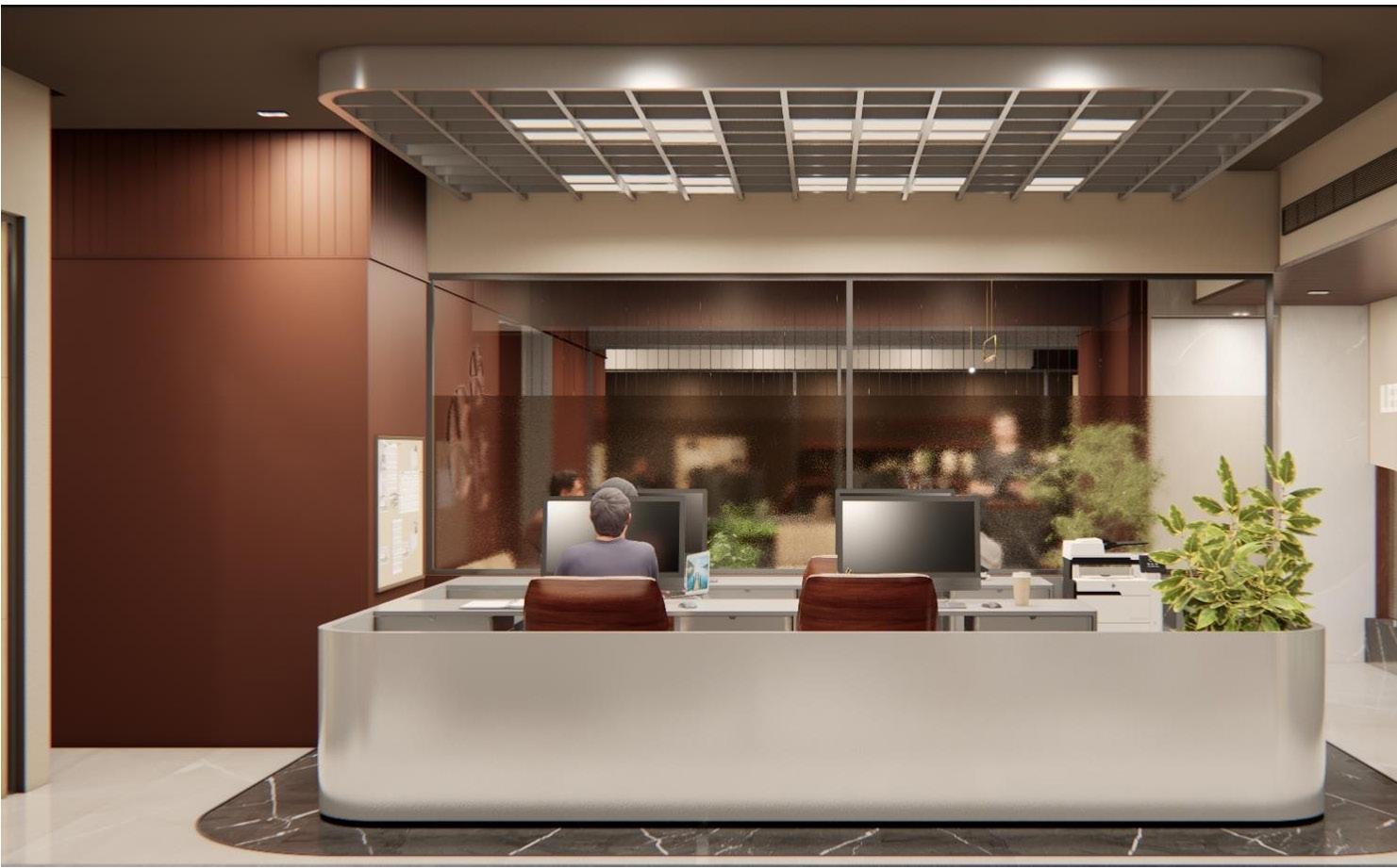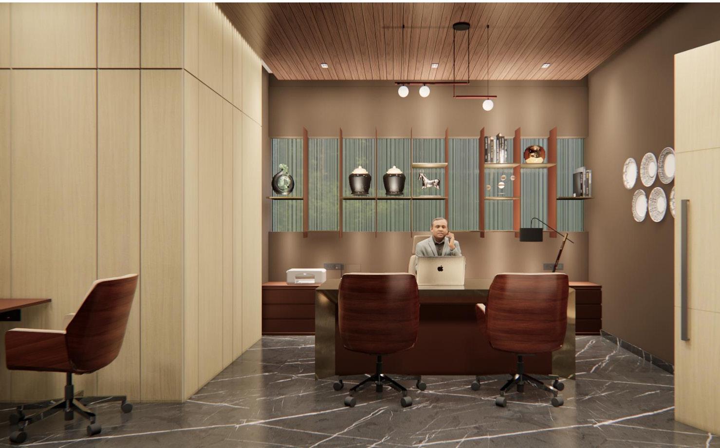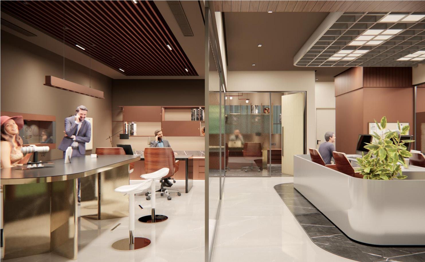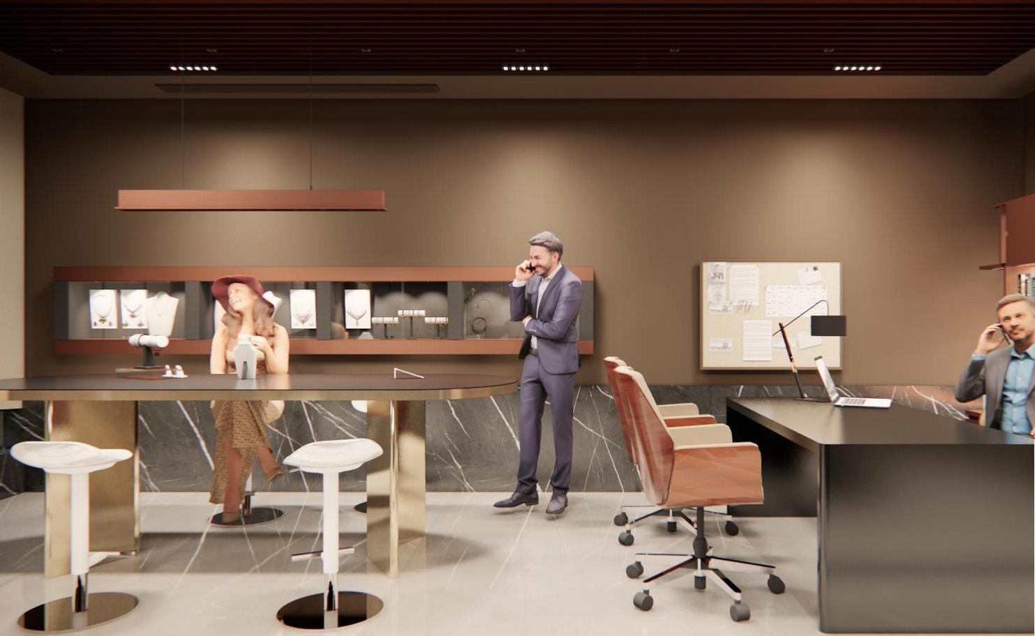 The jewelry office interior features a warm color palette with brown tones, creating an inviting ambiance. White marble flooring throughout the space provides a clean and bright backdrop, while grey marble flooring adds sophistication and contrast in select areas. A prominent mirror wall in the reception area enhances the sense of space and elegance, while a baffle ceiling seamlessly extends from the reception to the accounts area, providing a cohesive design element. The studio area is meticulously designed to display jewelry pieces effectively, with well-placed lighting fixtures highlighting the beauty of the collections. Overall, the office exudes a luxurious yet welcoming atmosphere, perfect for showcasing exquisite jewelry.