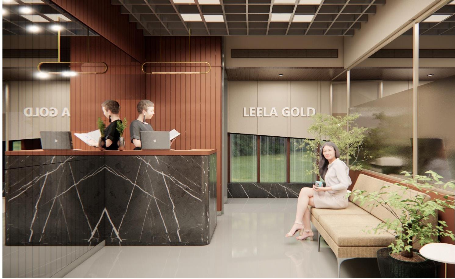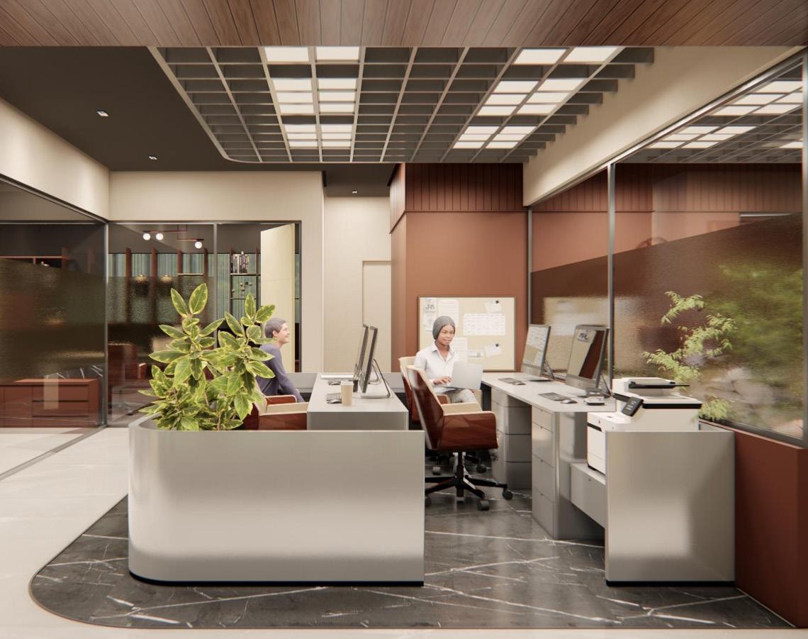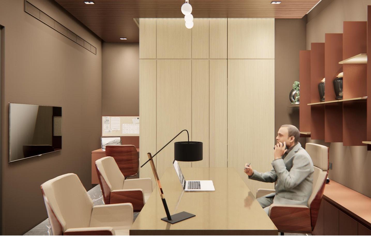 The jewelry office interior features a warm color palette with brown tones, creating an inviting ambiance. White marble flooring throughout the space provides a clean and bright backdrop, while grey marble flooring adds sophistication and contrast in select areas. A prominent mirror wall in the reception area enhances the sense of space and elegance, while a baffle ceiling seamlessly extends from the reception to the accounts area, providing a cohesive design element. The studio area is meticulously designed to display jewelry pieces effectively, with well-placed lighting fixtures highlighting the beauty of the collections. Overall, the office exudes a luxurious yet welcoming atmosphere, perfect for showcasing exquisite jewelry.