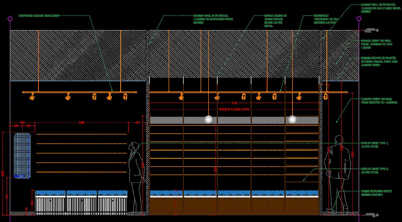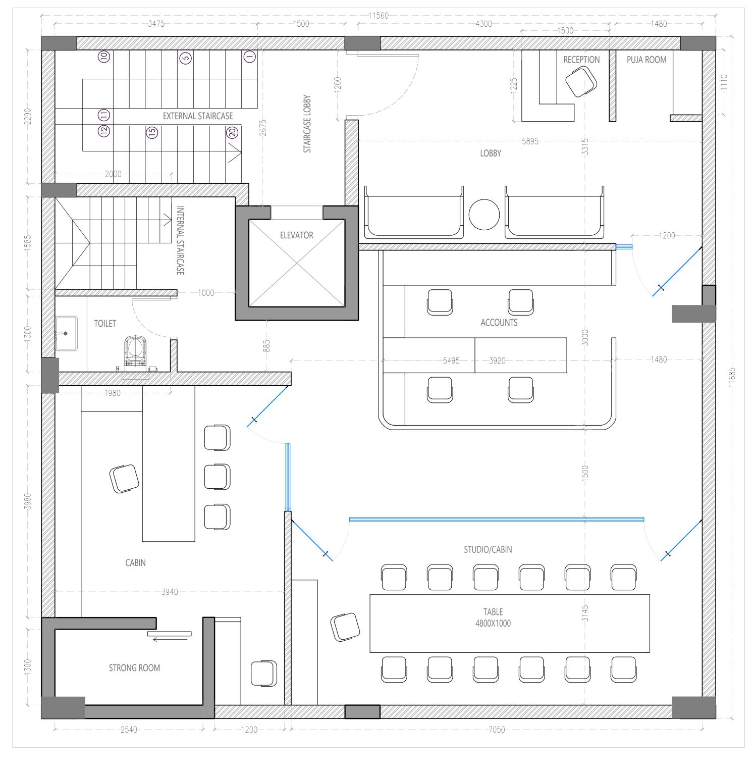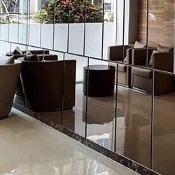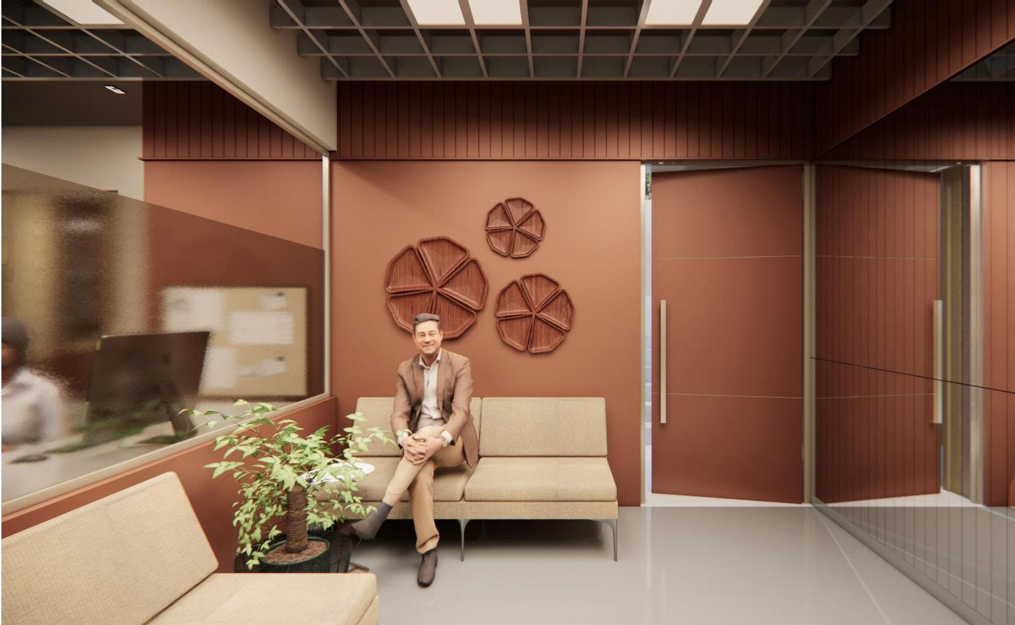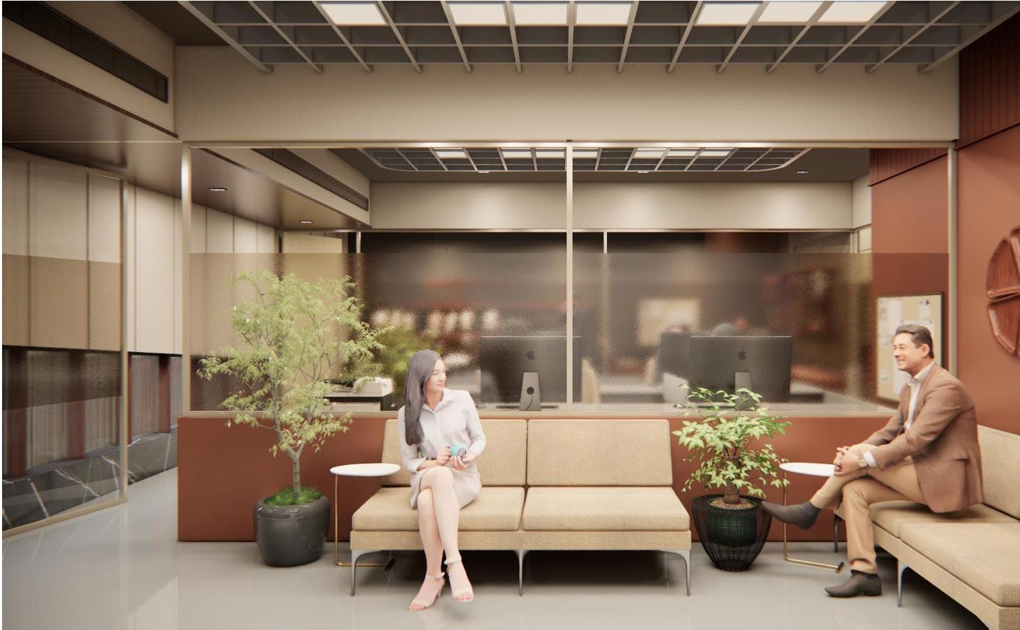 The jewelry office interior features a warm color palette with brown tones, creating an inviting ambiance. White marble flooring throughout the space provides a clean and bright backdrop, while grey marble flooring adds sophistication and contrast in select areas. A prominent mirror wall in the reception area enhances the sense of space and elegance, while a baffle ceiling seamlessly extends from the reception to the accounts area, providing a cohesive design element. The studio area is meticulously designed to display jewelry pieces effectively, with well-placed lighting fixtures highlighting the beauty of the collections. Overall, the office exudes a luxurious yet welcoming atmosphere, perfect for showcasing exquisite jewelry.