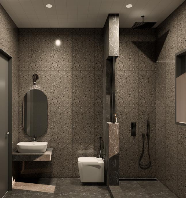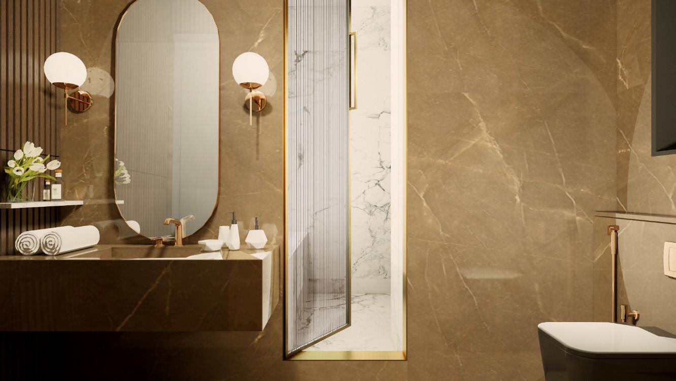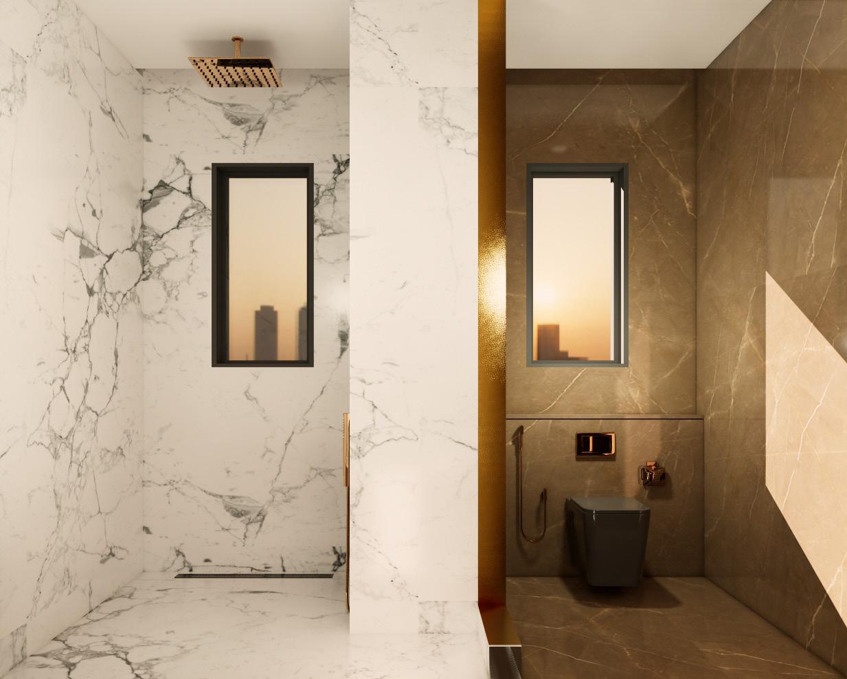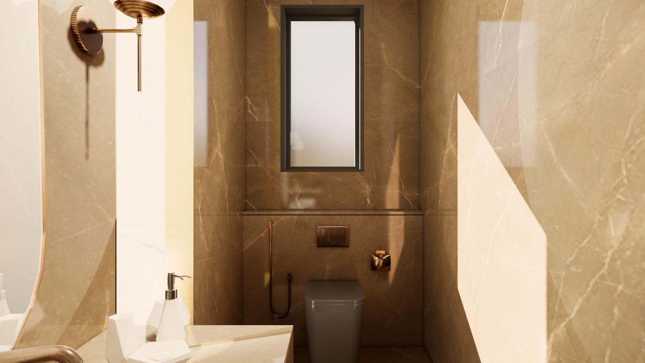 The toilet is divided into wet and dry zones using contrasting materials and a fluted glass door. Using brass fixtures the two spaces are tied together.