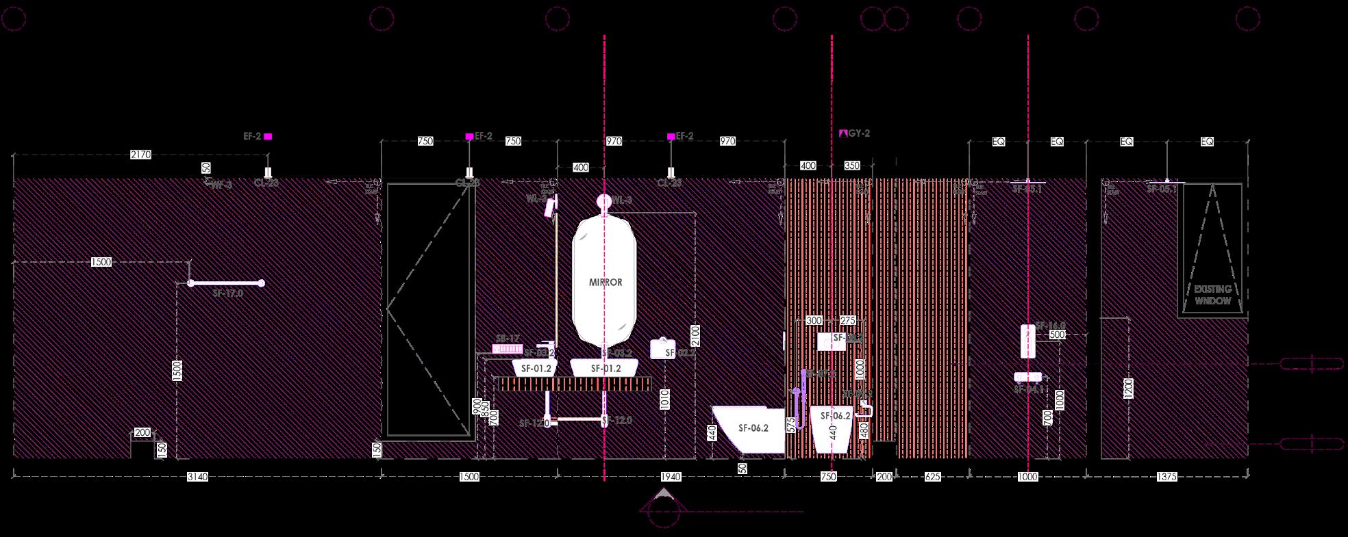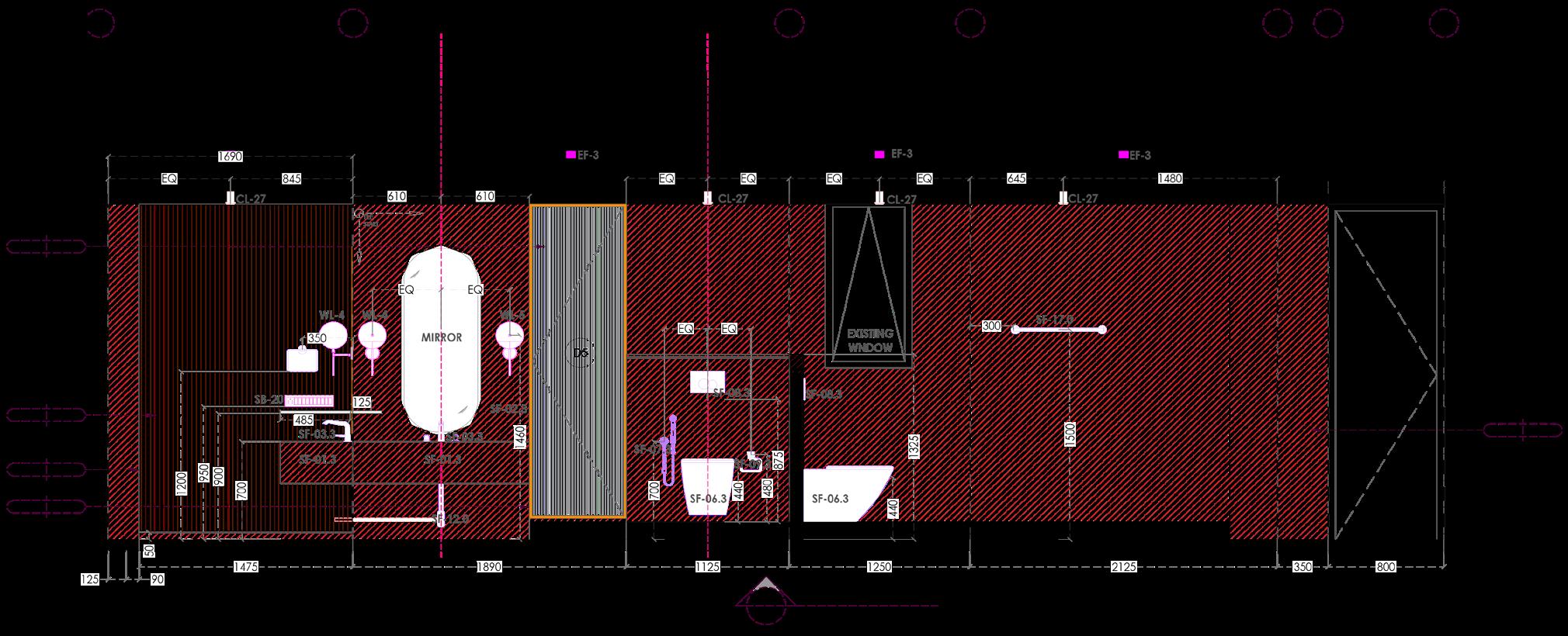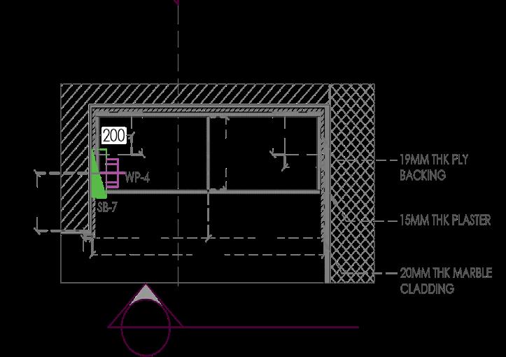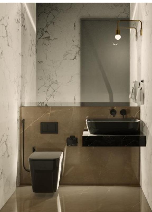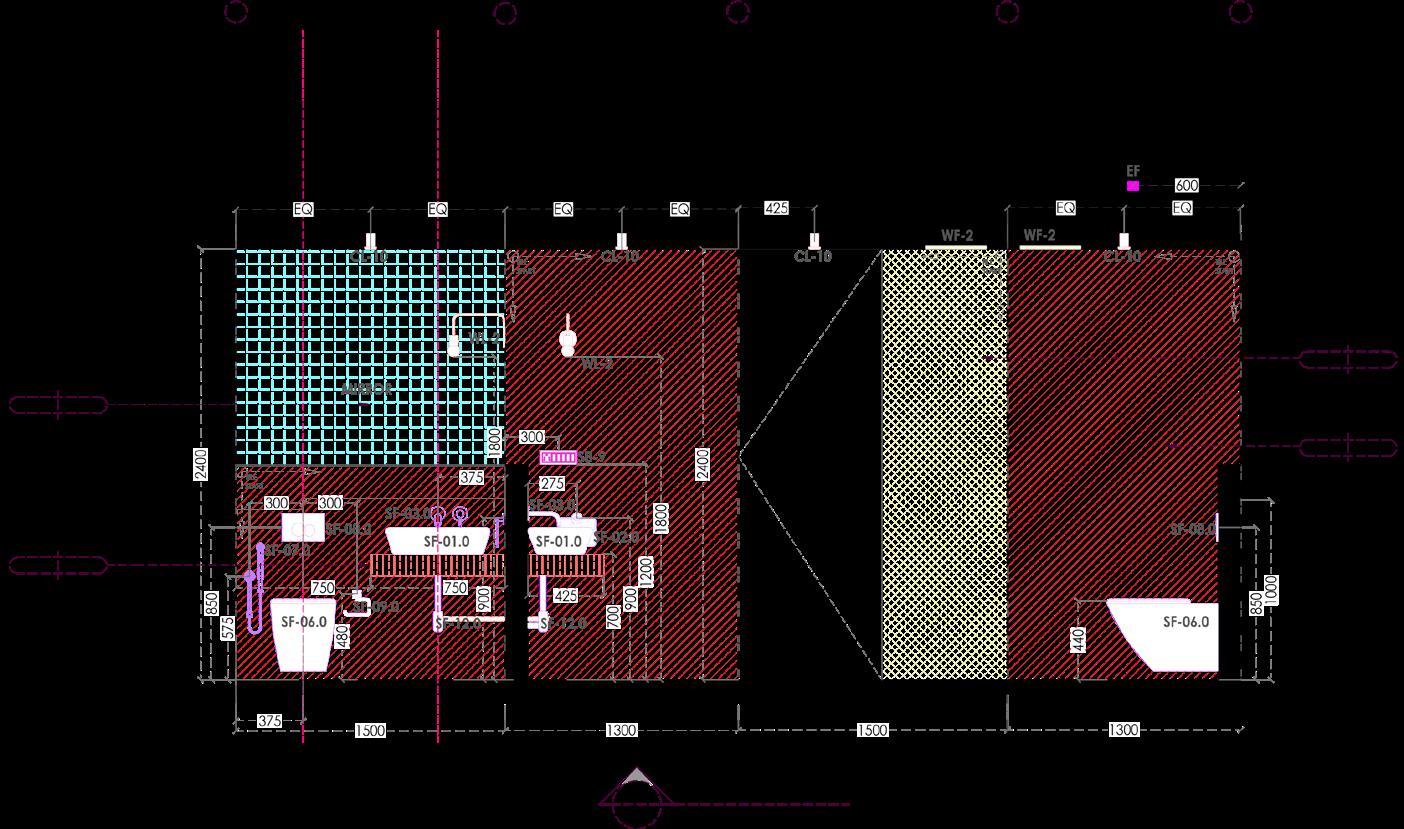The toilet is divided into wet and dry zones using contrasting materials and a fluted glass door. Using brass fixtures the two spaces are tied together.