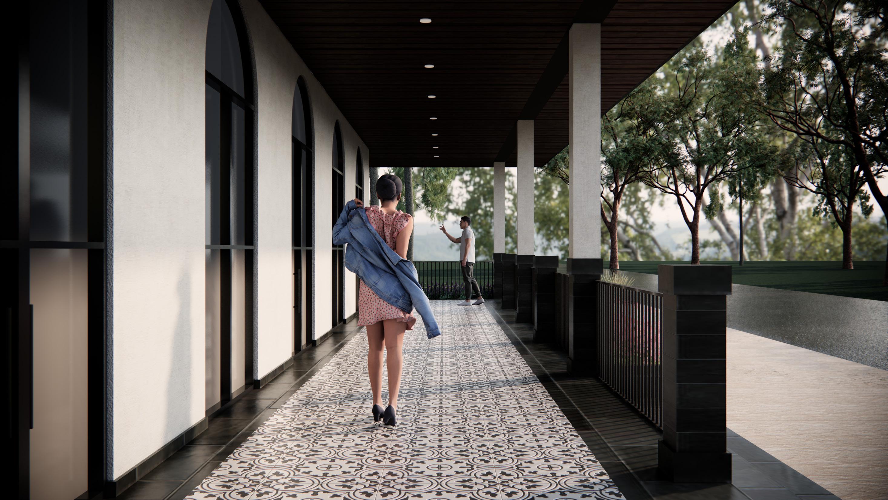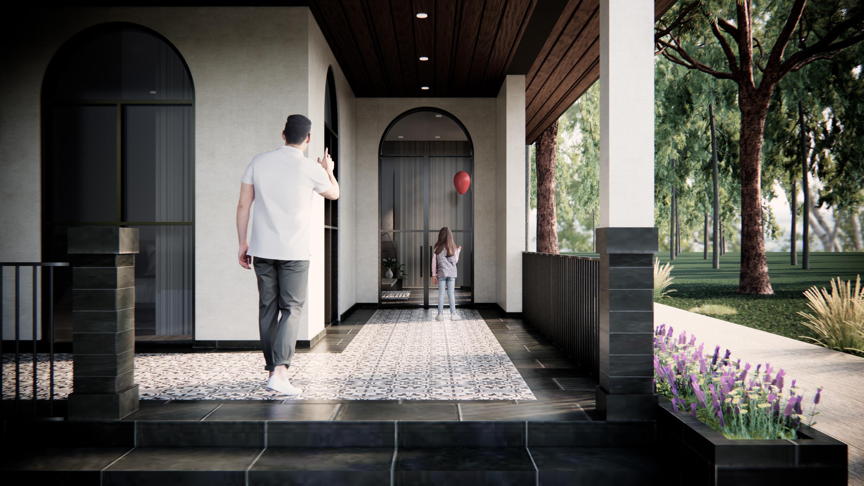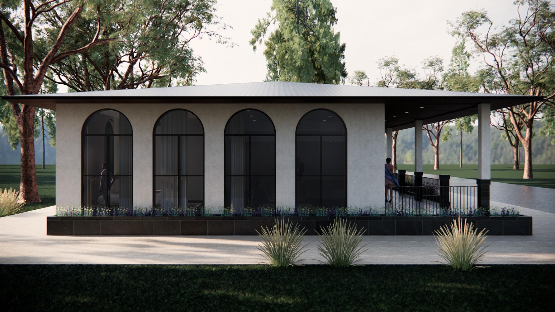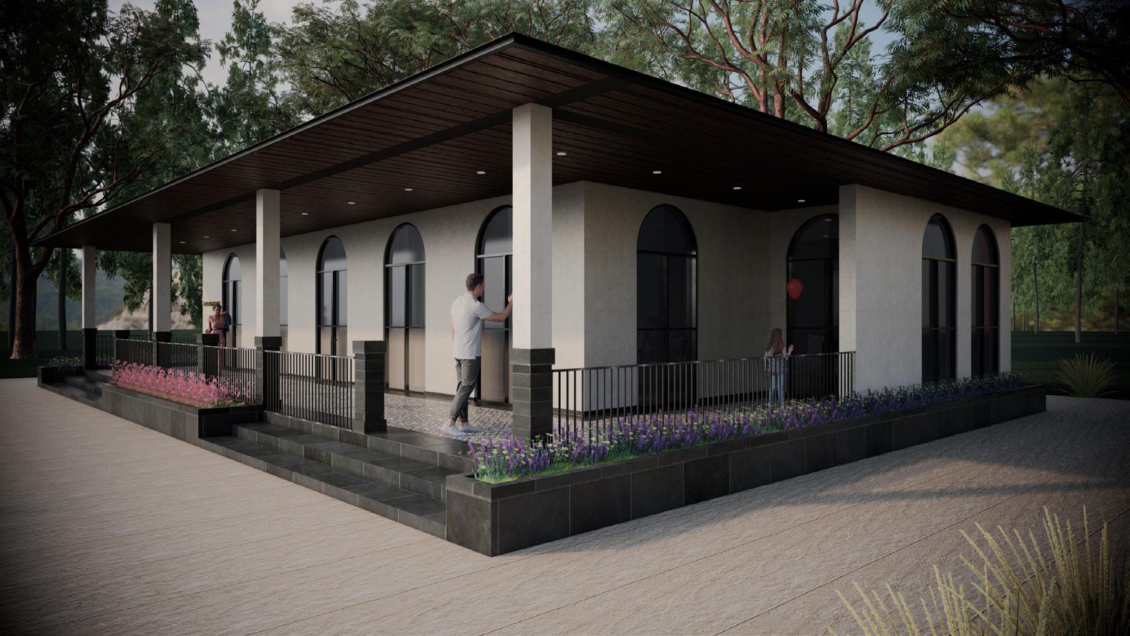 The guest house boasts a contemporary design featuring concrete finish walls that exude a sleek and modern aesthetic. Its inviting entrance is adorned with a portico, offering a welcoming ambiance to guests. The structure is characterized by expansive arch windows, allowing ample natural light to flood the interior while providing picturesque views of the surrounding landscape. Topped with a durable metal roof, the guest house stands as a resilient and enduring structure amidst the lush greenery of dense trees, creating a tranquil and secluded retreat for visitors to enjoy.