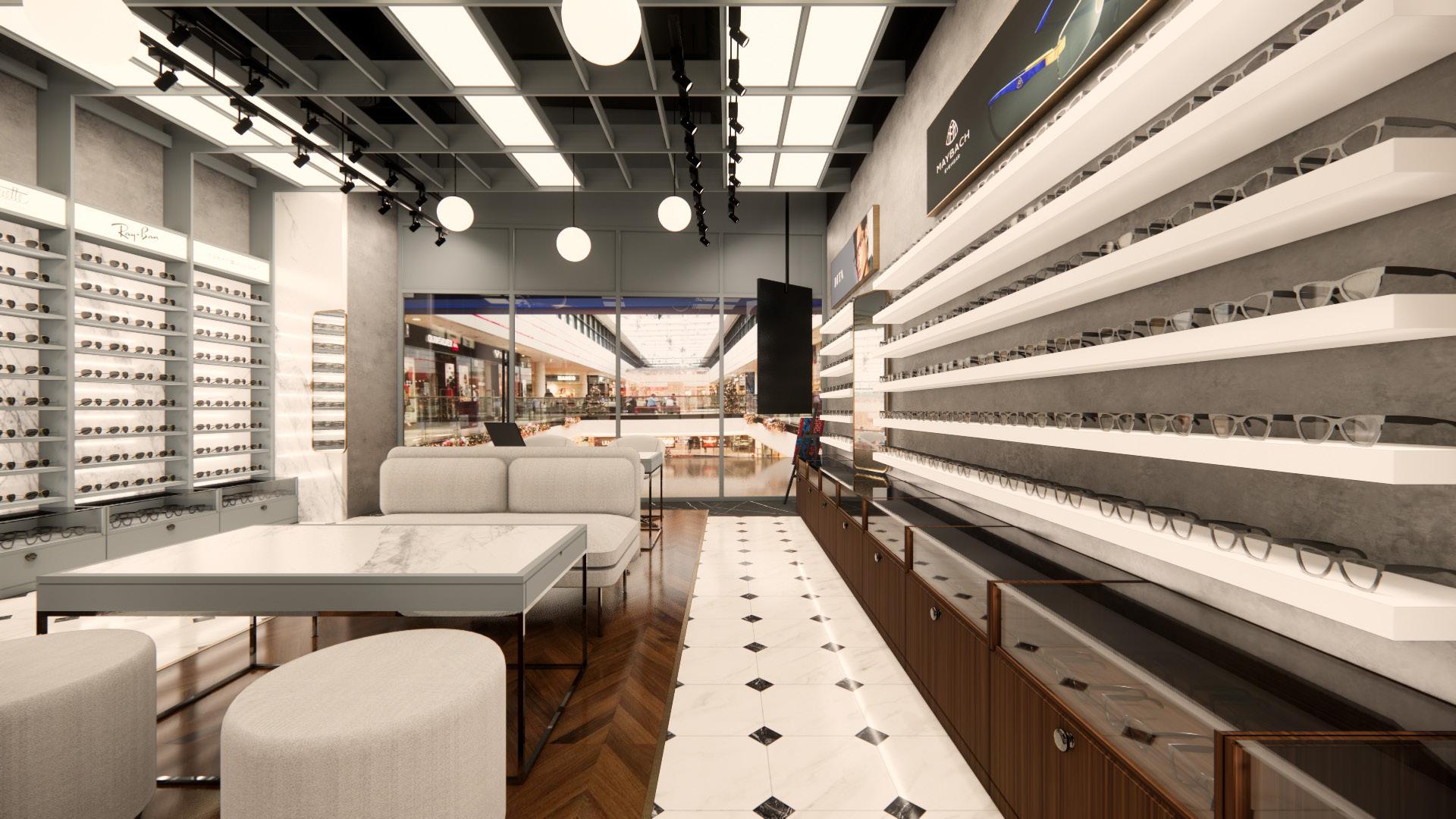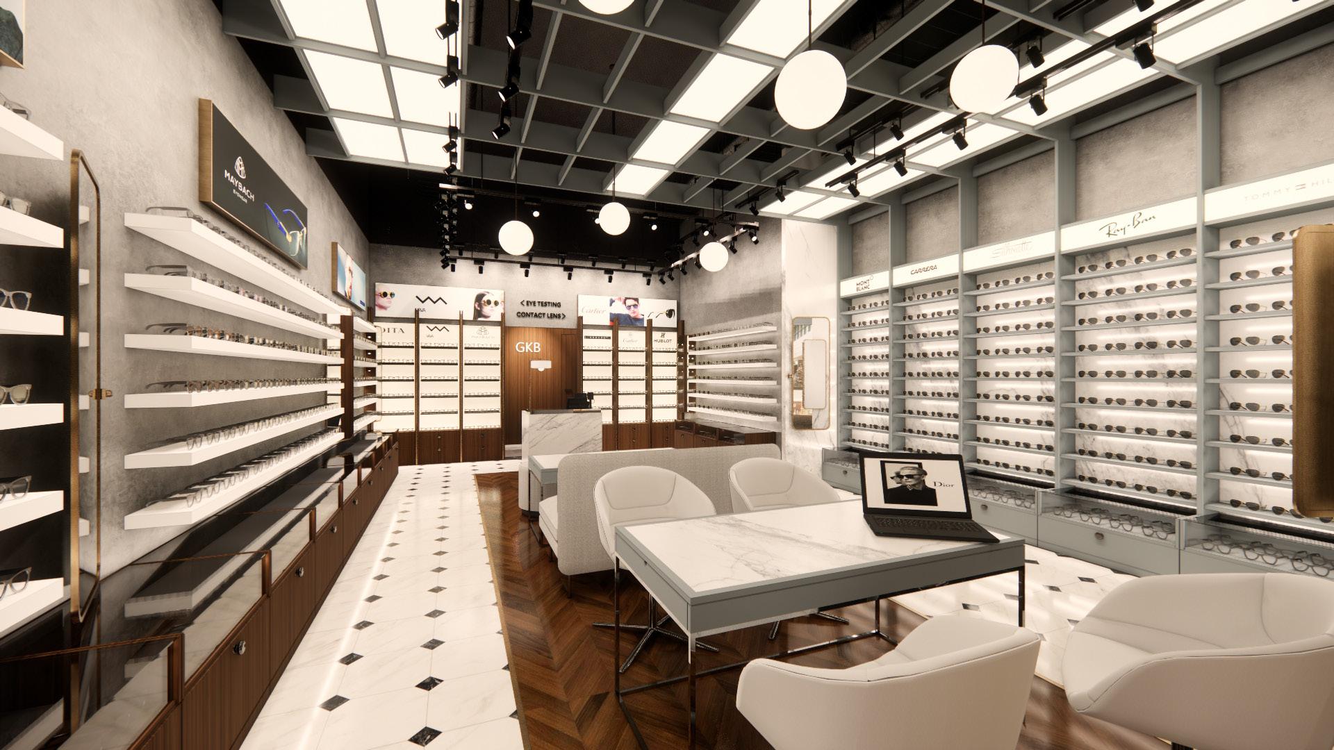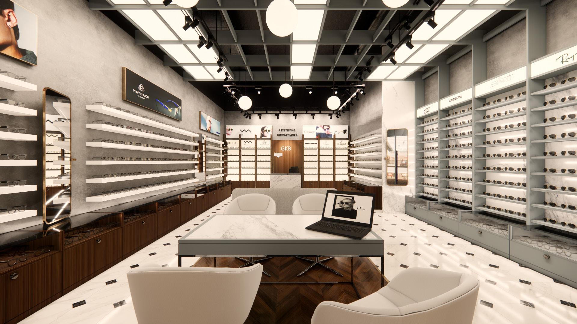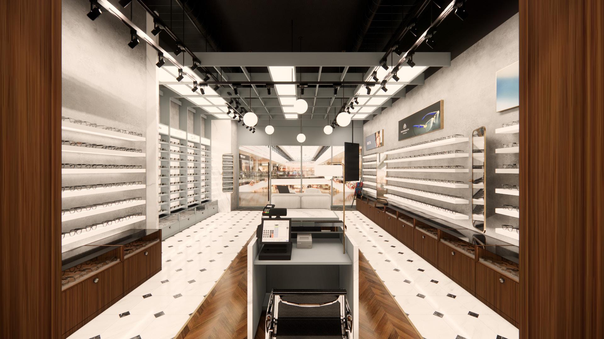 The layout embraces an open concept, allowing for fluid movement and a sense of spaciousness. Marble flooring or accents add a touch of elegance, while veneer finishes on display fixtures and furniture provide warmth and richness. Sleek and minimalistic display shelving showcases eyewear collections, allowing them to become focal points within the space. Lighting fixtures are carefully selected to enhance the ambiance and highlight key areas such as the reception desk. Overall, the design exudes sophistication and refinement, creating an inviting environment that elevates the optical studio experience for both customers and staff.