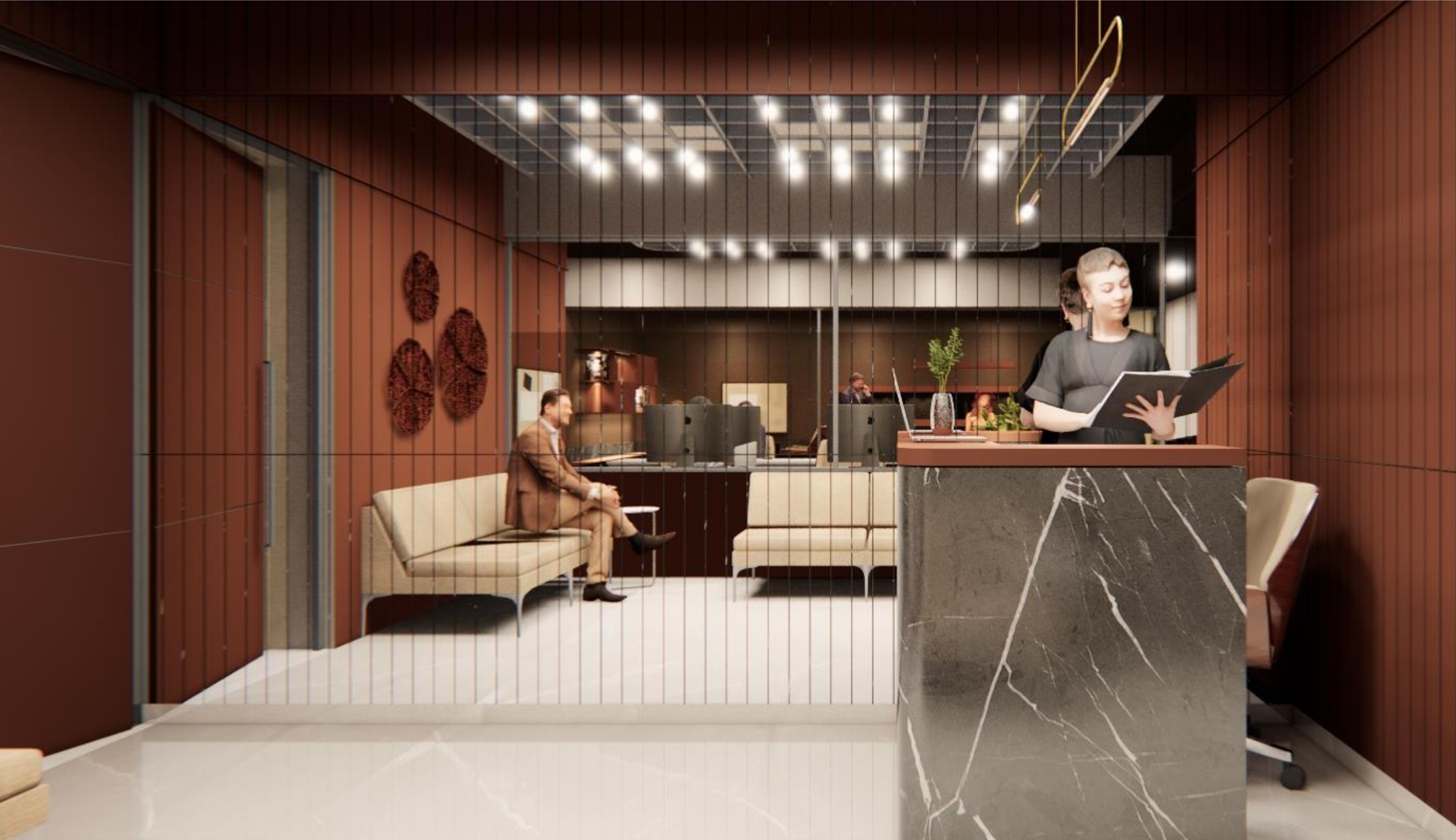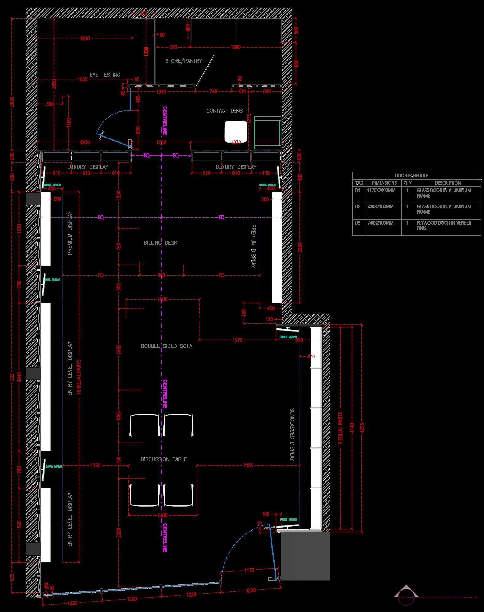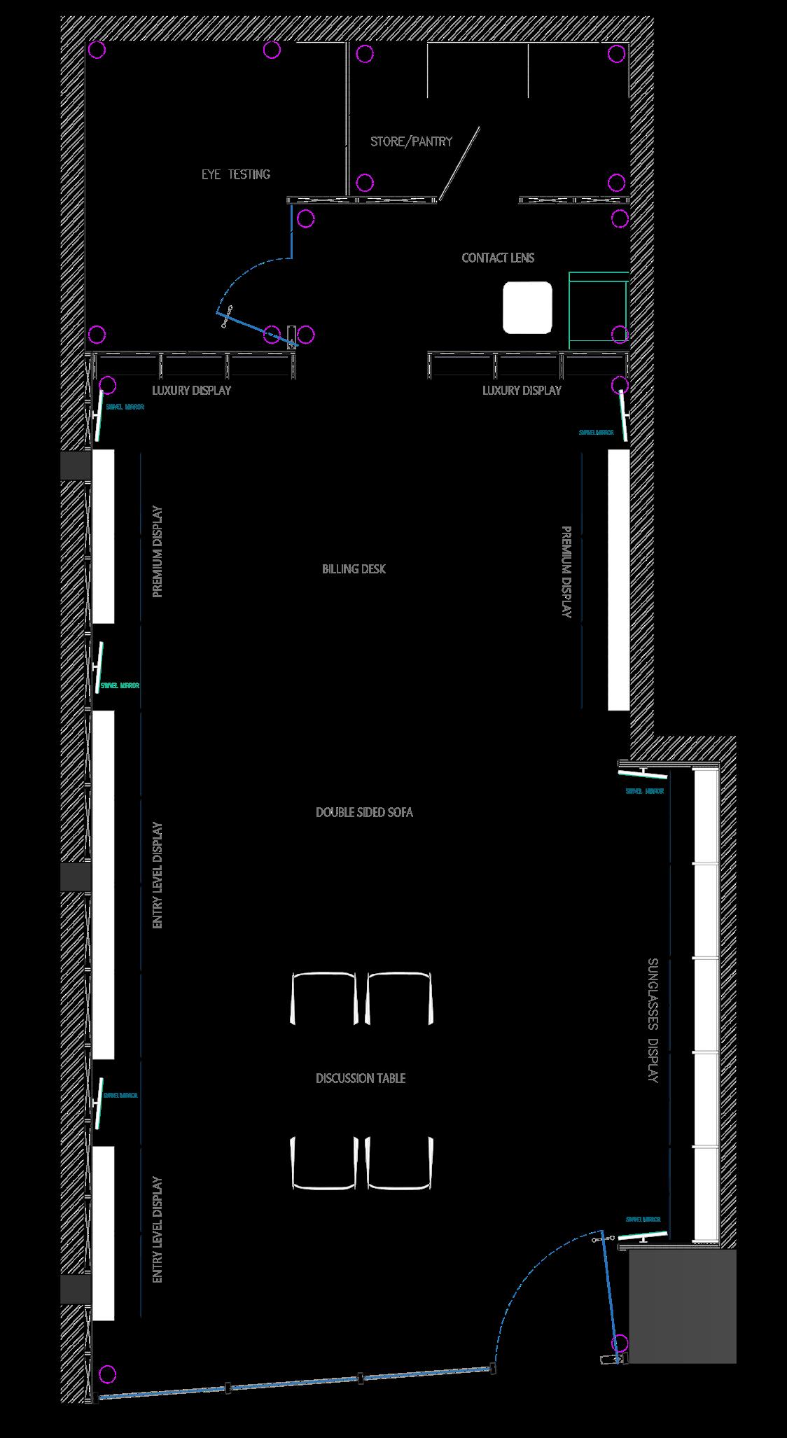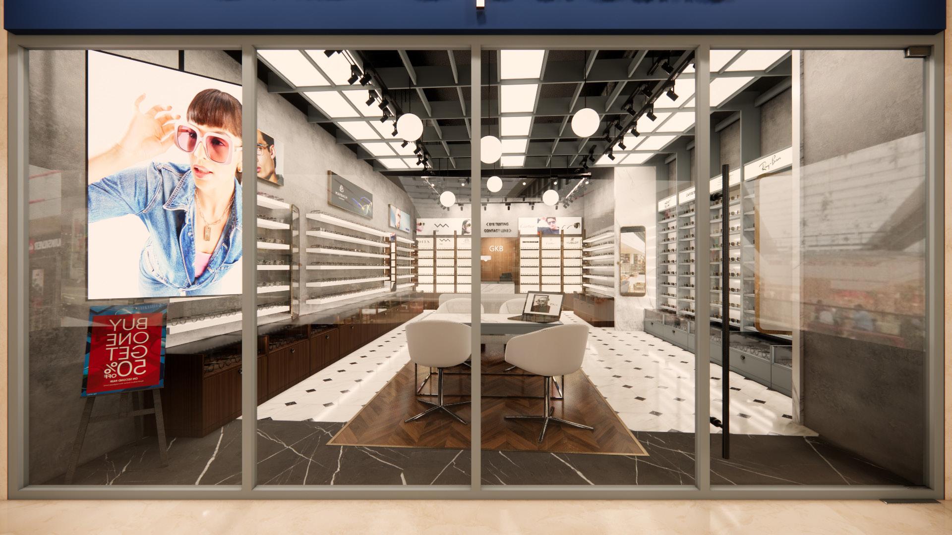 The layout embraces an open concept, allowing for fluid movement and a sense of spaciousness. Marble flooring or accents add a touch of elegance, while veneer finishes on display fixtures and furniture provide warmth and richness. Sleek and minimalistic display shelving showcases eyewear collections, allowing them to become focal points within the space. Lighting fixtures are carefully selected to enhance the ambiance and highlight key areas such as the reception desk. Overall, the design exudes sophistication and refinement, creating an inviting environment that elevates the optical studio experience for both customers and staff.