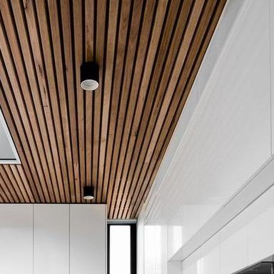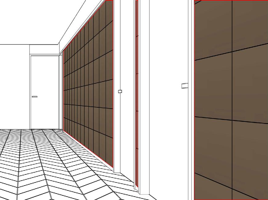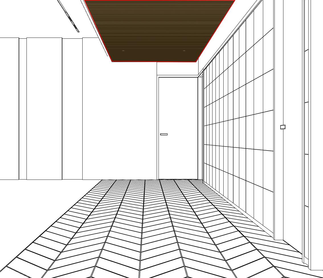 In order to compliment the flooring in the entrance corridor the ceiling is dropped down and cladded in ribbed wooden panels.
