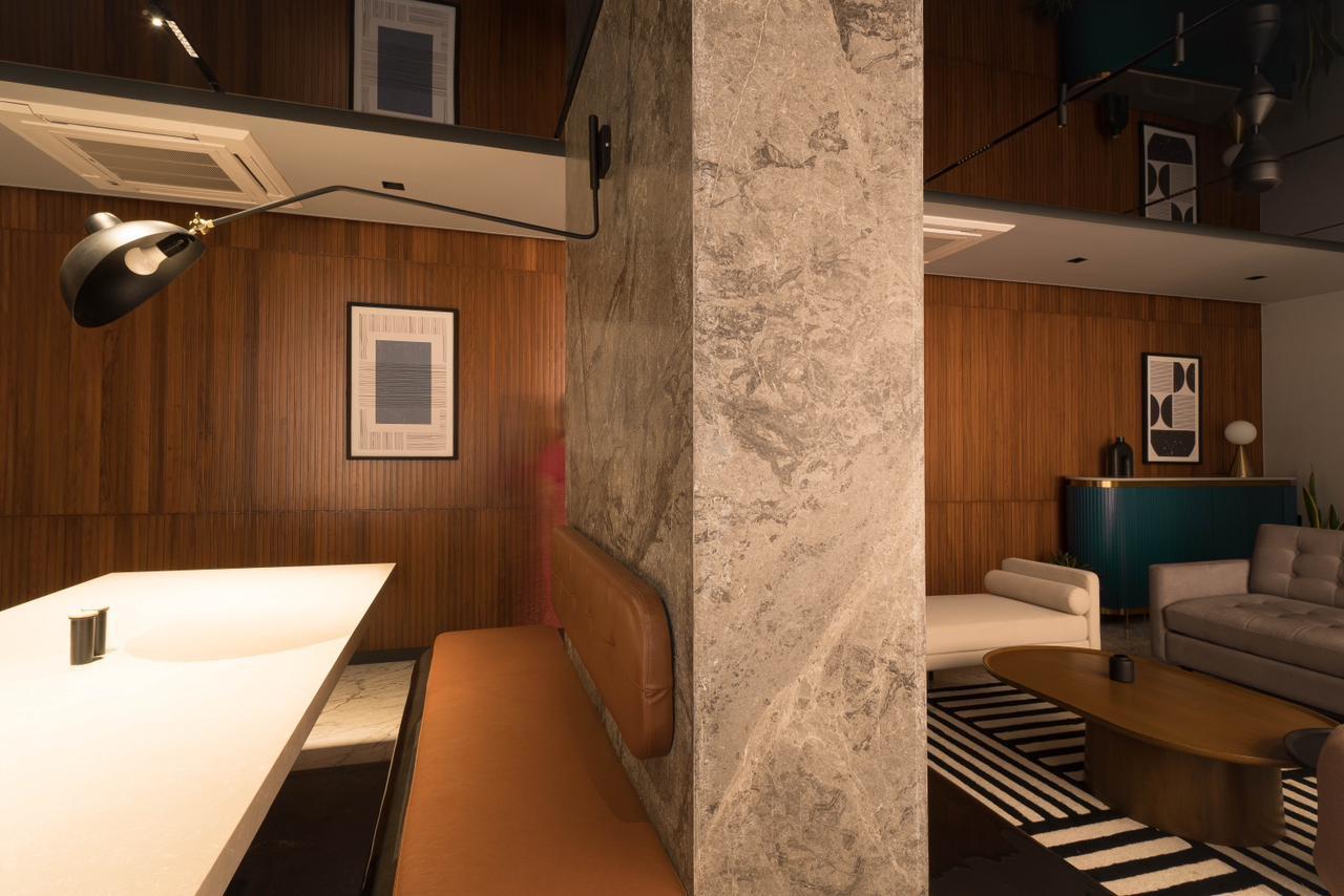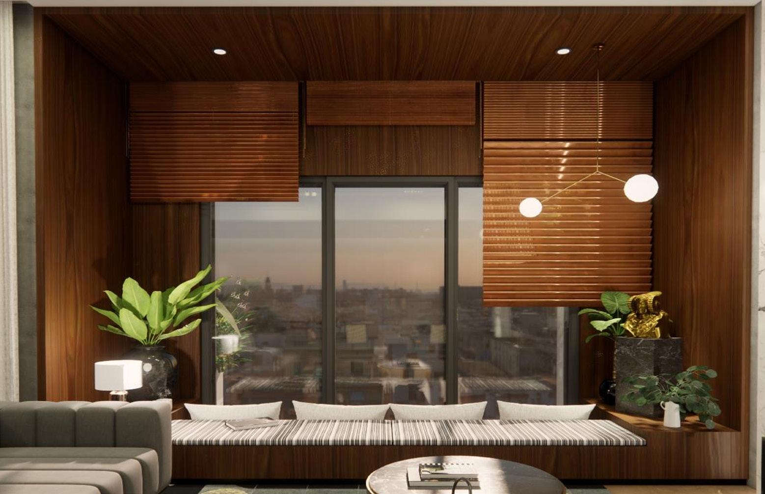 Inspired by the setting of a tradition Japanese tea ceremony, this element frames the view of the city for a warm cozy, flexible corner to unwind.