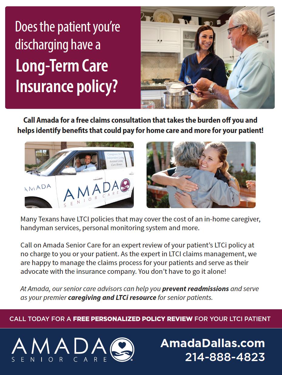 1 Does the patient you’re discharging have a Call Amada for a free claims consultation that takes the burden o you and helps identify bene ts that could pay for home care and more for your patient! Long-Term Care Insurance policy? Many Texans have LTCI policies that may cover the cost of an in-home caregiver, handyman services, personal monitoring system and more. Call on Amada Senior Care for an expert review of your patient’s LTCi policy at no charge to you or your patient. As the expert in LTCI claims management, we are happy to manage the claims process for your patients and serve as their advocate with the insurance company. You don’t have to go it alone! At Amada, our senior care advisors can help you prevent readmissions and serve as your premier caregiving and LTCi resource for senior patients. CALL TODAY FOR A FREE PERSONALIZED POLICY REVIEW FOR YOUR LTCI PATIENT AmadaDallas.com 214-888-4823 ® C M Y CM MY CY CMY K 7.5x10 Bleed.pdf 1 4/18/23 12:04 PM