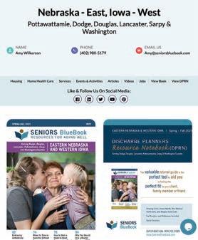FALL 2023 – SPRING 2024 FREE 2 The Truth About Cash Home Buying 39 Overcoming the Mental Health Stigma 43 Why You Should Hire a Realtor Who Is an SRES EASTERN NEBRASKA AND WESTERN IOWA Serving Dodge, Douglas, Lancaster, Pottawattamie, Sarpy and Washington Counties SENIORS Blue Book TM RESOURCES FOR AGING WELL 82 Planning For a Successful Move To Senior Living Visit us at: SeniorsBlueBook.com/local/Nebraska-Iowa FREE REFERRAL LINE 800.201.9989