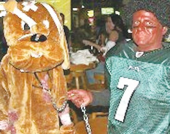 the jersey of former NFL quarterback Michael Vick and holds a chain attached to a collar around the neck of another person dressed as an injured dog. Vick admitted to participating in a dog-fighting ring and was sentenced to prison not long before the photos of Kennedy were posted on Facebook.