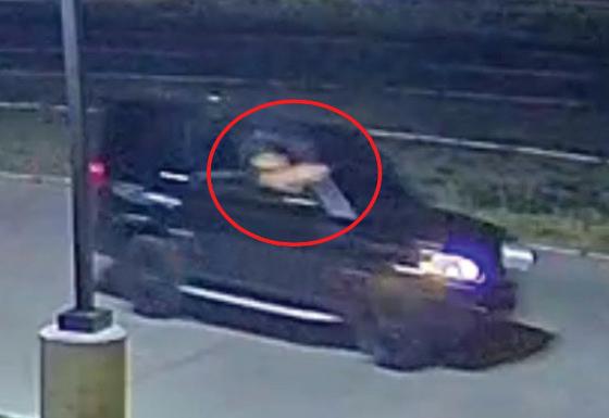 ABOVE: A still shot from security video depicts a man leaning out of a car window brandishing a gun as it pursued another vehicle. SOURCE AURORA POLICE ARREST AFFIDAVIT