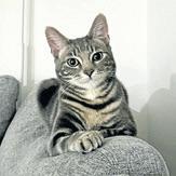 A 5 month old one-of-a-kind kitten with a personality as striking as my looks! I’m the ultimate mix of playful and affectionate - I meow sweetly for your attention, flop onto the floor for a dramatic roll, and happily melt into bliss during head scratches. Whether I’m curled up beside you for cuddles or entertaining you with my silly antics, I’ll fill your home with joy, love, and laughter. I’m currently living with a kitten who’s slightly older than me and I love to follow him around - playing, exploring the house and climbing to great heights. I’ll do well in a home with another feline friend. I also get along with my medium sized gentle foster dog. My adoption fee is $300.